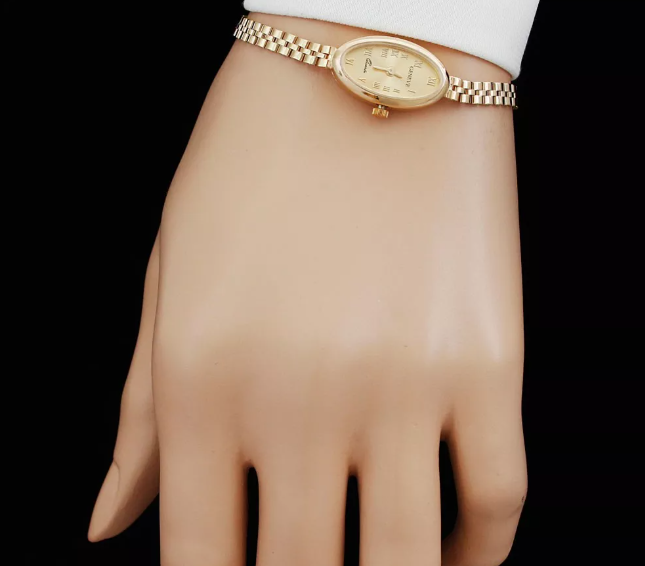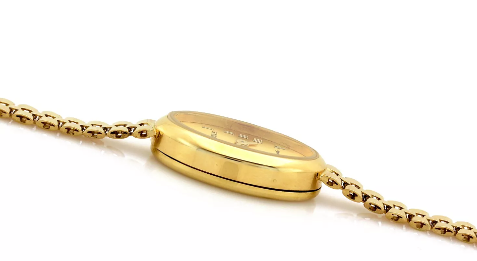 Luxusné dámske hodinky zo 14-karátového žltého zlata s oválnym ciferníkom a presným quartzovým strojčekom. Elegantný doplnok pre modernú ženu. Oválny ciferník s jemnými rímskymi číslicami pôsobí klasicky a sofistikovane, zatiaľ čo článkový náramok zo zlata zaručuje pohodlné nosenie a luxusný vzhľad.