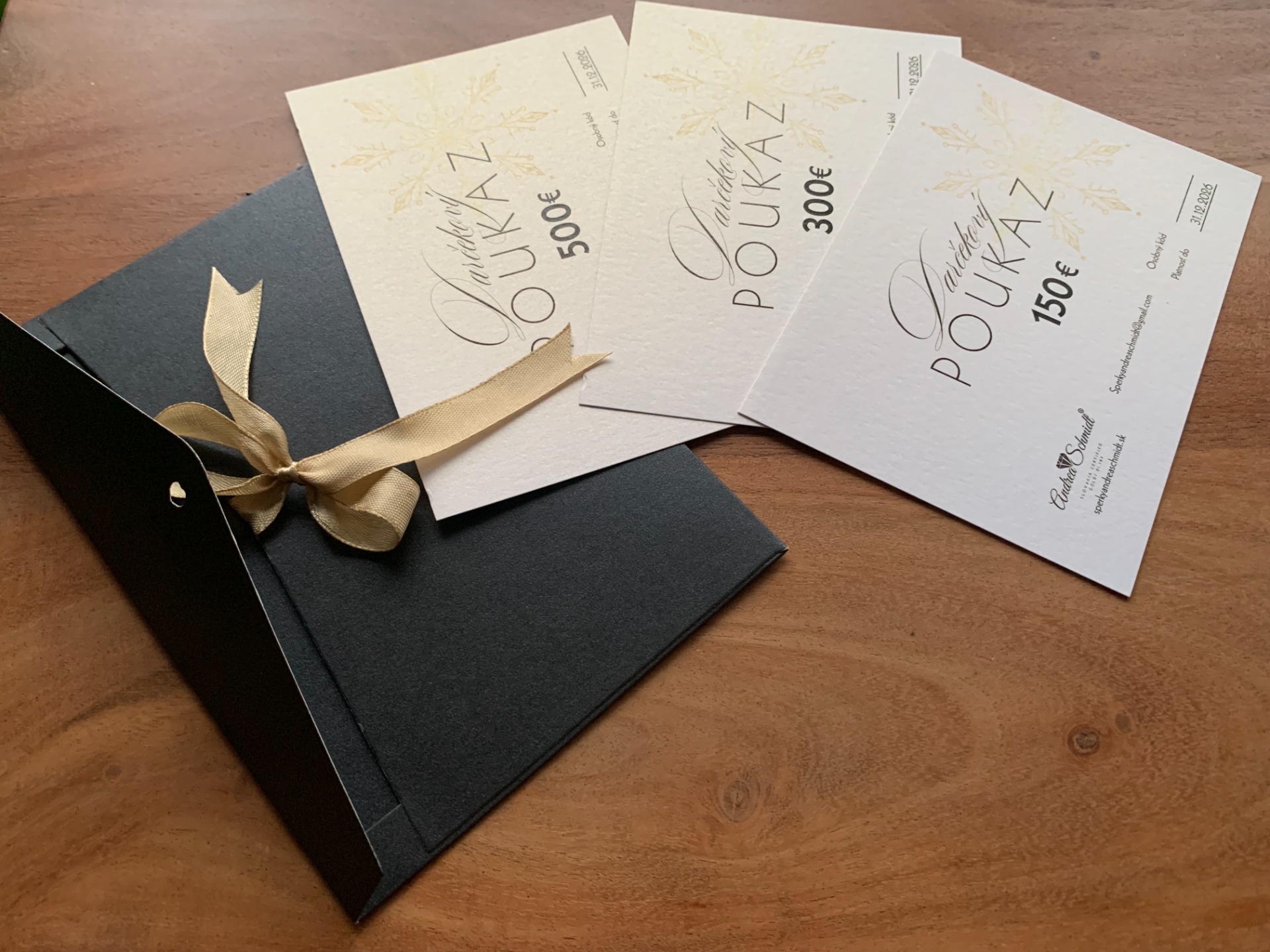 Poukaz je vyrobený z kvalitného metalického papiera s jemným leskom, ktorý pôsobí exkluzívne a elegantne.