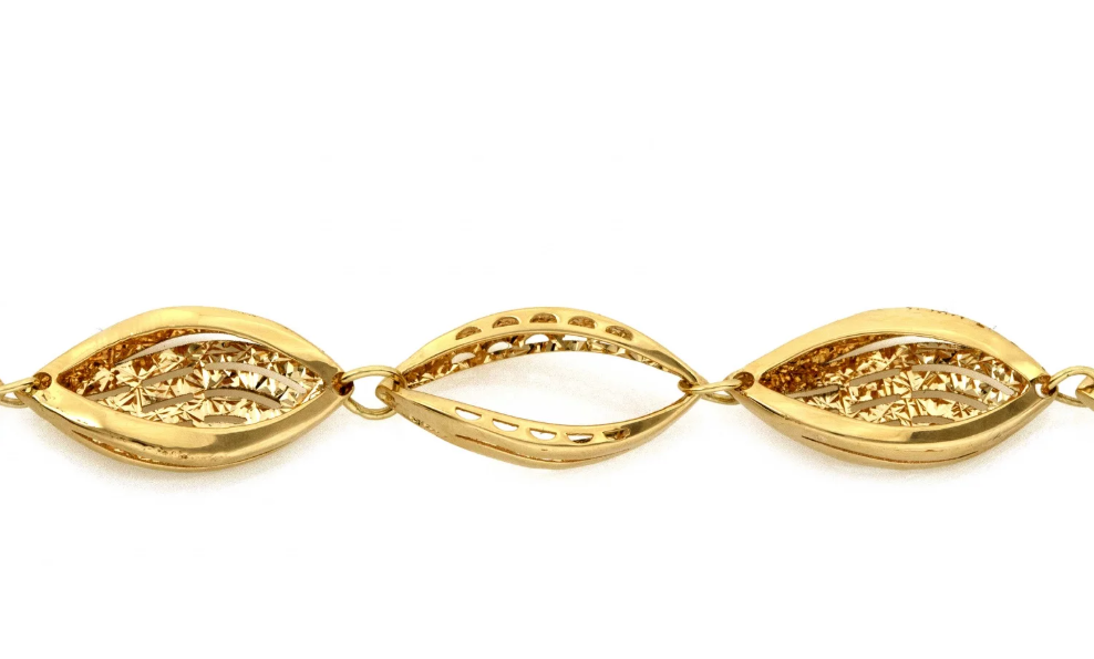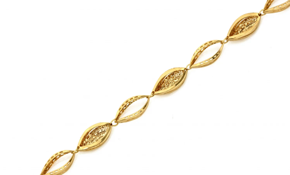 Dizajnový náramok Élan d'Or je oslavou plynulých línií a vyváženého dizajnu. Jeho pravidelne radené, jemne pretiahnuté články vytvárajú elegantný pohyb okolo zápästia a dodávajú šperku ľahkosť a prirodzený lesk.