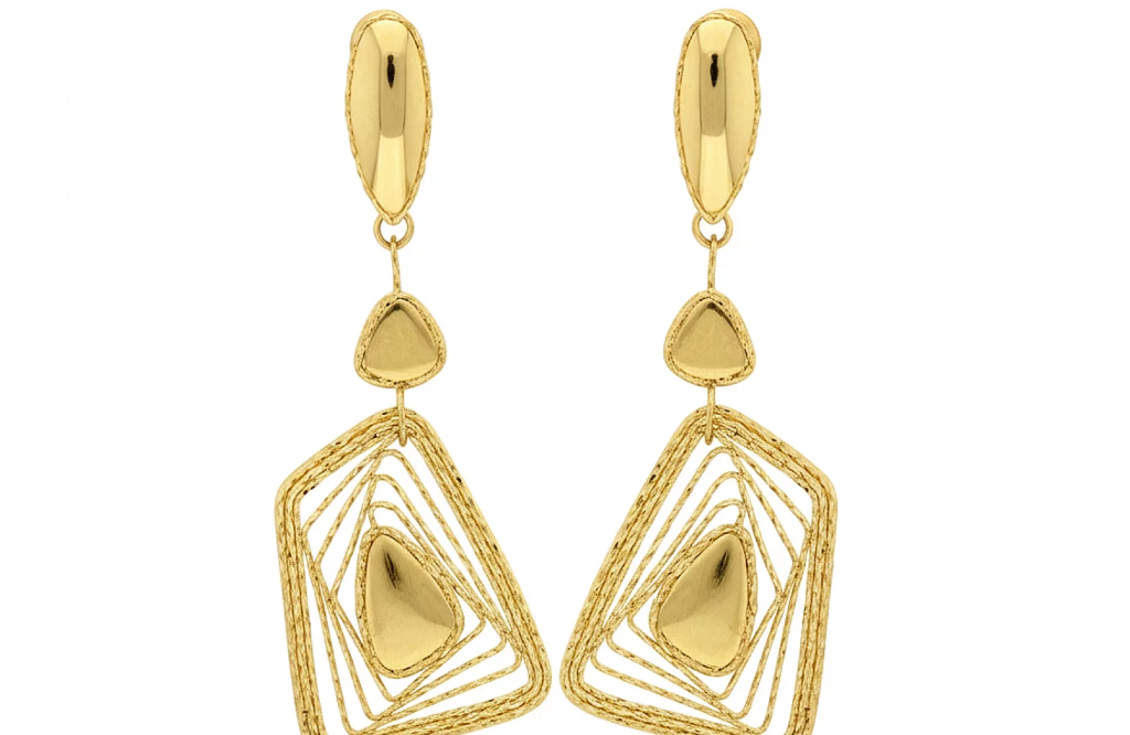 Náušnice Golden Aurelia Geometry Earrings zaujmú originálnou kombináciou jemných tvarov a prepracovanej geometrie. Vrstvené línie v trojuholníkovom motíve vytvárajú ľahký, vzdušný efekt, ktorý krásne pracuje so svetlom a pohybom. Hladké zlaté plôšky v strede dodávajú dizajnu harmonickú rovnováhu a elegantný kontrast.