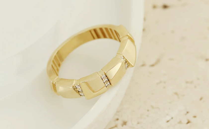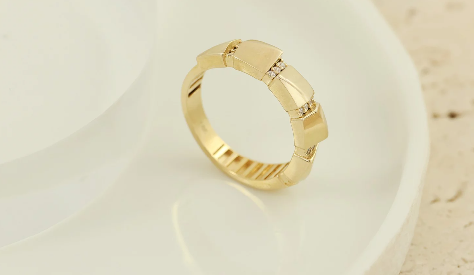 Golden Carré Élégance Ring je moderný dizajnový prsteň zo 14-karátového zlata, ktorý spája architektonickú presnosť s nadčasovou eleganciou. Charakteristickým prvkom prsteňa sú pravidelne tvarované zlaté segmenty, medzi ktorými sú osadené drobné zirkóny. Tie vytvárajú decentný kontrast a dodávajú šperku jemný, ale luxusný lesk.