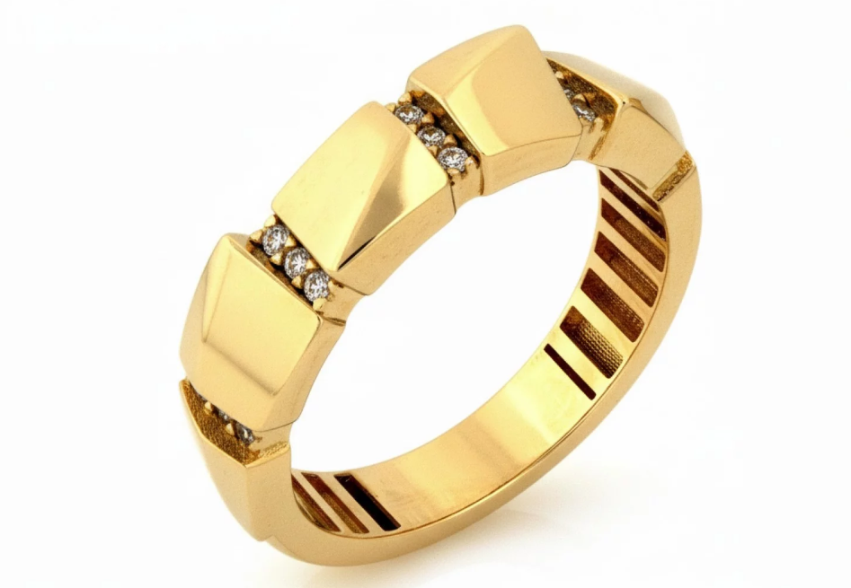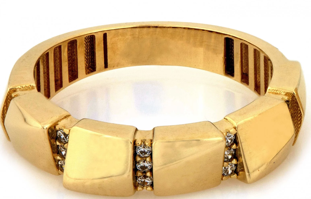 Výrazný zlatý prsteň s moderným geometrickým dizajnom, doplnený o jemné zirkóny, ktoré mu dodávajú sofistikovaný lesk. Dizajnový kúsok pre ženy, ktoré milujú čisté línie a luxusný minimalizmus.