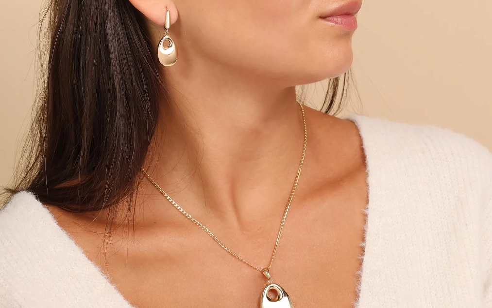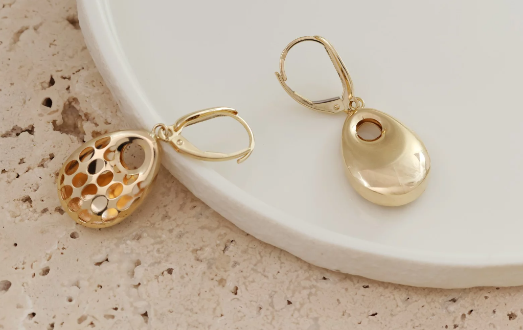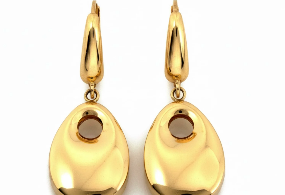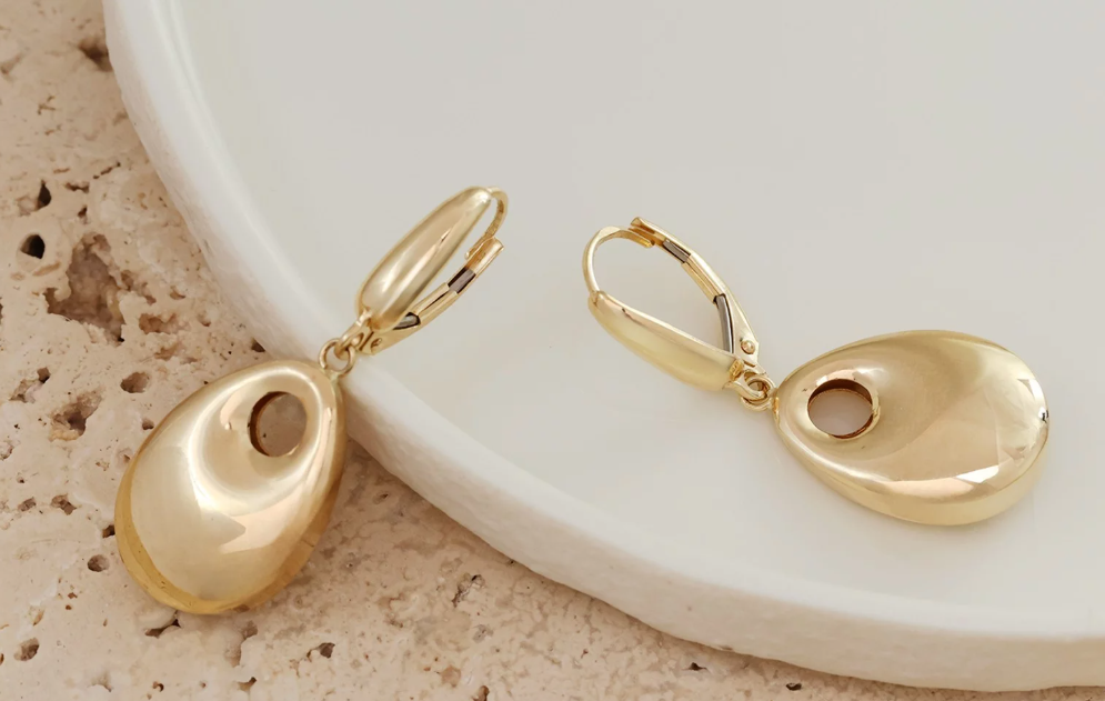 Náušnice Golden Éclipse Earrings zaujmú na prvý pohľad svojím jemne oválnym, kvapkovitým tvarom s lesklým povrchom, ktorý nádherne odráža svetlo. Minimalistický dizajn dopĺňa decentný otvor v hornej časti náušnice, ktorý vytvára zaujímavý vizuálny detail a dodáva šperku moderný charakter.