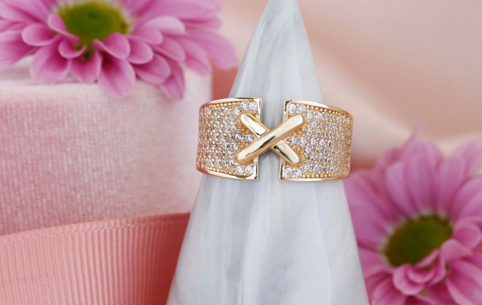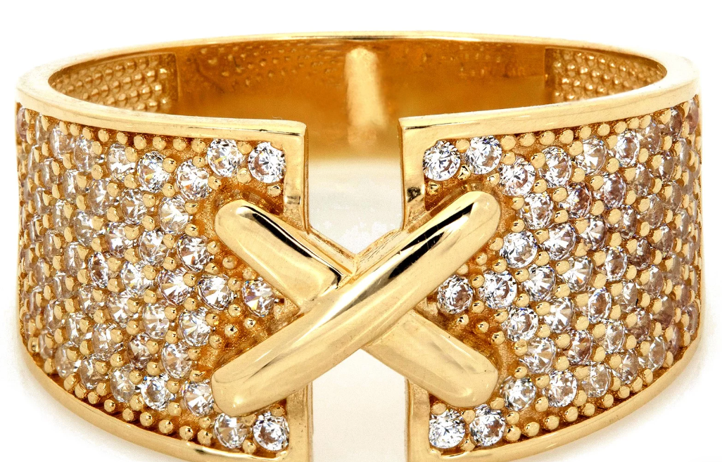 Luxusný zlatý dizajnový prsteň so zirkónmi, zdobený prekríženým motívom a bohatým osadením drobných čírych zirkónov. Elegantný a výrazný šperk s nadčasovým charakterom.