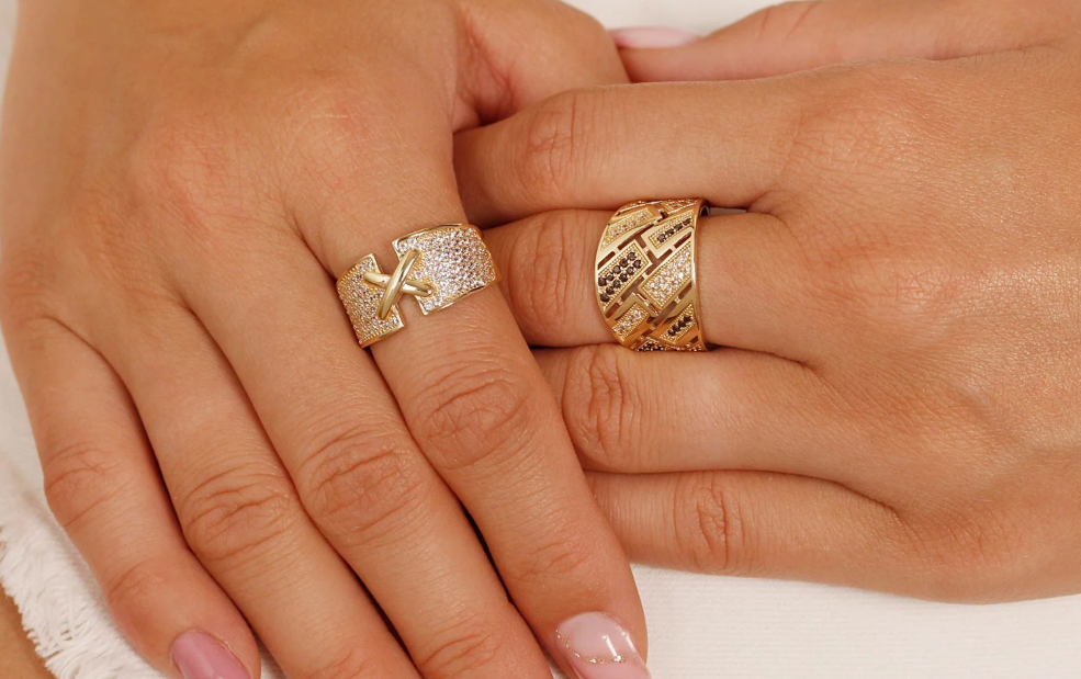 Široké línie prsteňa pôsobia sebavedomo a elegantne, pričom kontrast medzi hladkým zlatým povrchom a jemným osadením zirkónov vytvára harmonický a vyvážený dizajn. Prsteň je výrazný, no zároveň ženský a sofistikovaný.