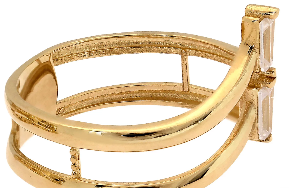 Golden Étreinte Ring je stelesnením modernej elegancie a čistého dizajnu. Dvojitá línia prsteňa symbolizuje prepojenie, rovnováhu a jemnú silu ženskosti. Hladké zlato kontrastuje s precízne osadenými baguette zirkónmi, ktoré dodávajú šperku sofistikovaný lesk bez prehnanej okázalosti.