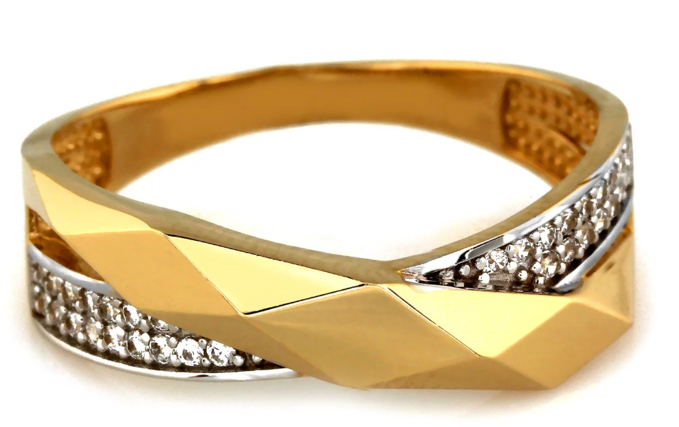 Výrazný dizajnový prsteň z 14k zlata s precízne brúseným povrchom a líniou trblietavých zirkónov. Moderný luxus s architektonickým charakterom.