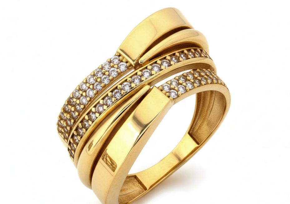 Luxusný zlatý dizajnový prsteň so zirkónmi, tvorený plynulými líniami a vrstveným dizajnom. Elegantný a výrazný šperk s nadčasovým charakterom.