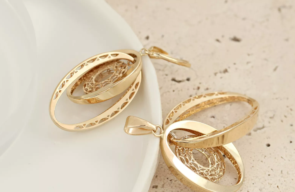 Náušnice Golden Orbit Luxe Earrings zaujmú na prvý pohľad sofistikovanou kompozíciou prepletených kruhov, ktoré sa jemne prelínajú a vytvárajú elegantný trojrozmerný efekt. Hladké lesklé línie kontrastujú s jemne zdobeným vnútorným prvkom, čím vzniká bohatá hra svetla a detailov pri každom pohybe.