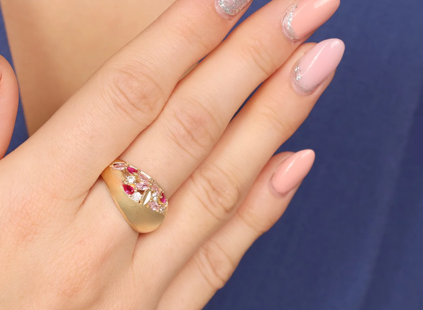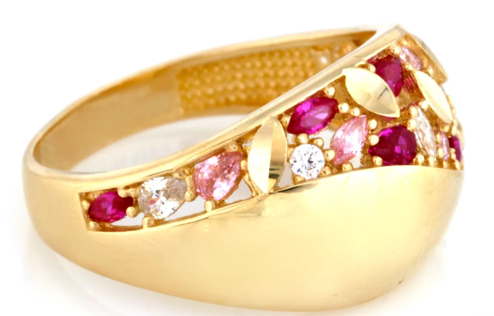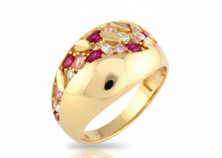 Luxusný zlatý dizajnový prsteň so zirkónmi v ružových a čírych tónoch. Elegantný a nadčasový šperk, ktorý spája jemnosť s výrazným dizajnom.