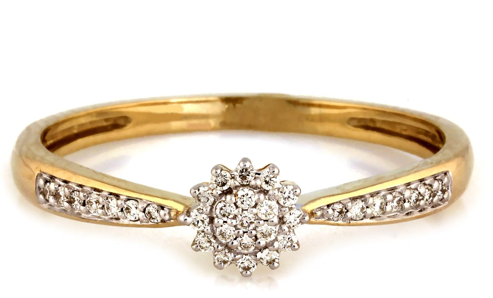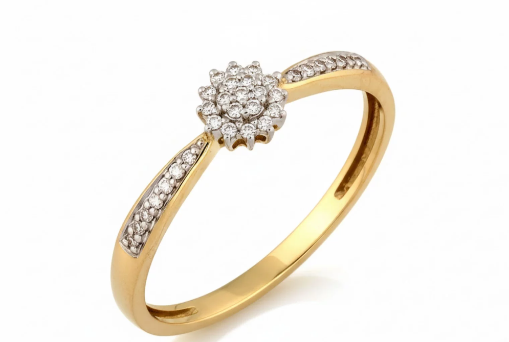 Elegantný zásnubný prsteň z kombinácie žltého a bieleho 14kt zlata, zdobený jemnou diamantovou bordúrou z prírodných briliantov. Nadčasový dizajn, ktorý dokonale symbolizuje lásku a výnimočný okamih zásnub.