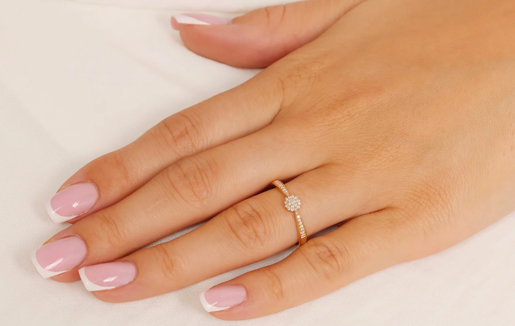 Tento zásnubný prsteň je vyhotovený z kombinácie žltého a bieleho zlata rýdzosti 585/1000 (14 kt), čo mu dodáva sofistikovaný kontrast a nadčasový vzhľad. Dominantou prsteňa je centrálna diamantová bordúra, tvorená drobnými prírodnými briliantmi, ktoré vytvárajú jemný, no výrazný lesk.