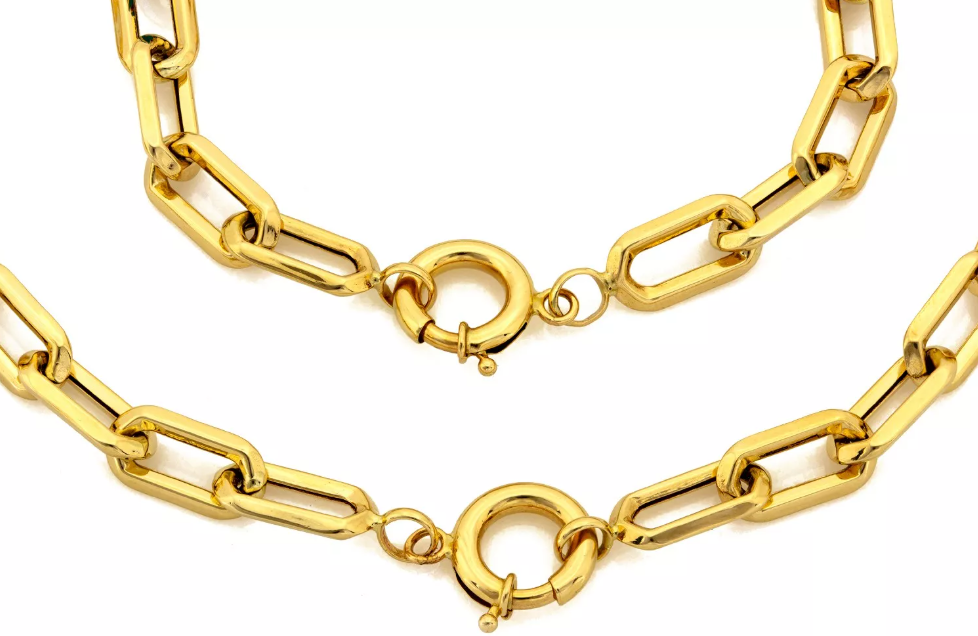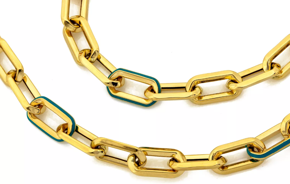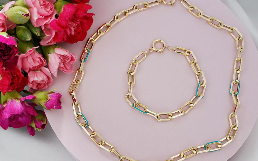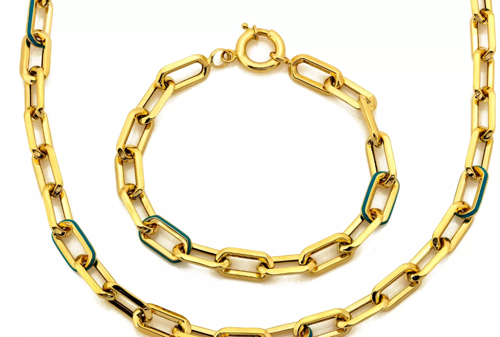 Trendy set zo 14-karátového žltého zlata s výraznými článkami zdobenými farebným smaltom. Spojenie moderného štýlu a nadčasovej elegancie.