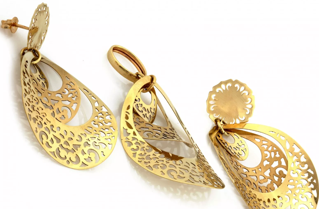 Exkluzívna sada zo 14-karátového žltého zlata s výrazným prelamovaným vzorom. Elegantná kombinácia umeleckého dizajnu a precízneho remeselného spracovania.