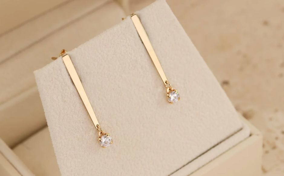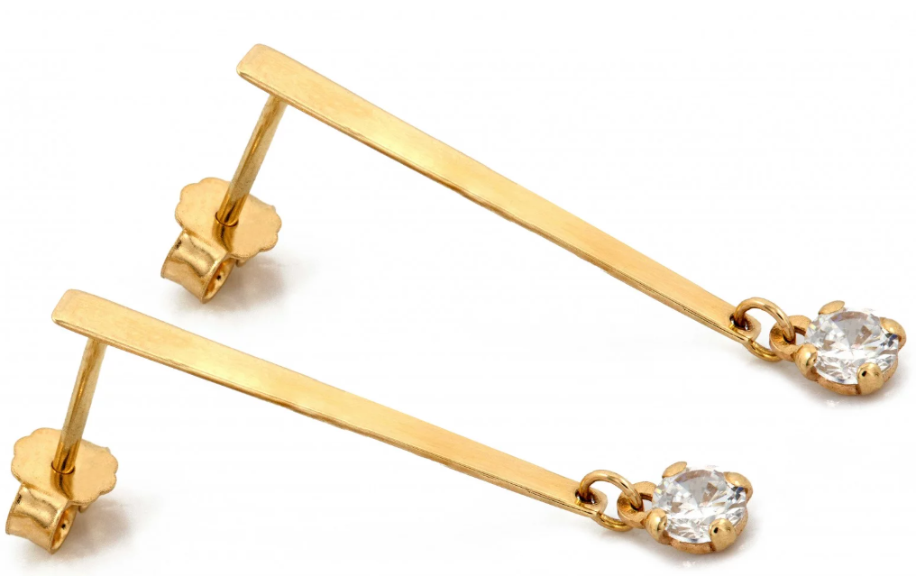 Jemné a elegantné visiace náušnice z 14-karátového zlata doplnené čírym zirkónom. Minimalistický dizajn, ktorý zvýrazní ženskosť a dodá outfitu jemný luxus.