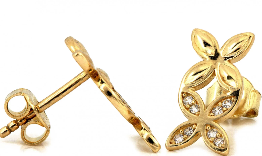 Elegantné dámske náušnice zo 14-karátového žltého zlata zdobené jemnými čírymi zirkónmi v kvetinovom vzore.