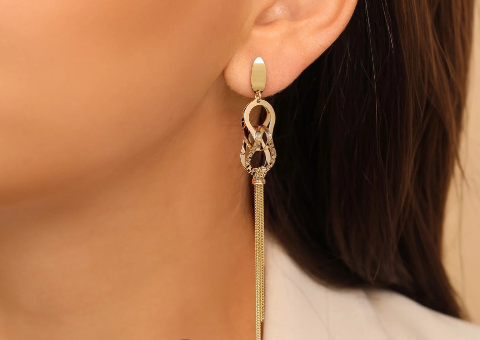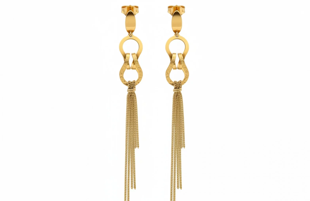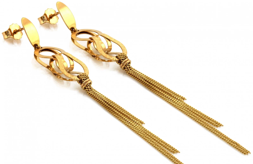 Elegantné zlaté náušnice s prepracovaným prepletaným vzorom a dlhými retiazkovými strapcami, ktoré vytvárajú luxusný efekt pri každom pohybe.
