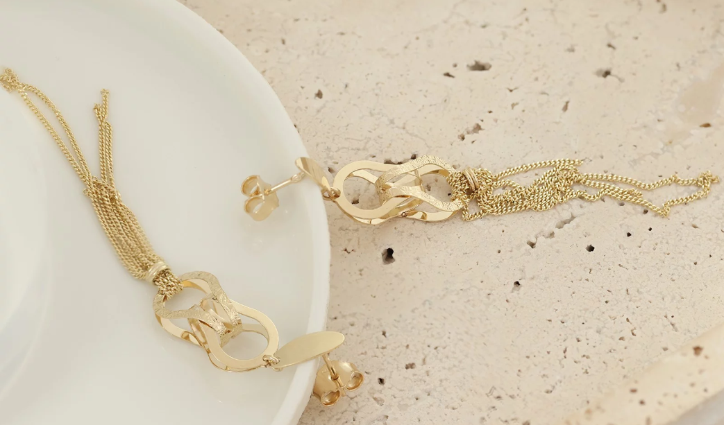 Tieto výrazné visacie náušnice sú dokonalým spojením elegancie a moderného dizajnu. Prepletané zlaté články pôsobia sofistikovane, pričom jemné retiazkové strapce dodávajú náušniciam ľahkosť, pohyblivosť a očarujúci lesk.