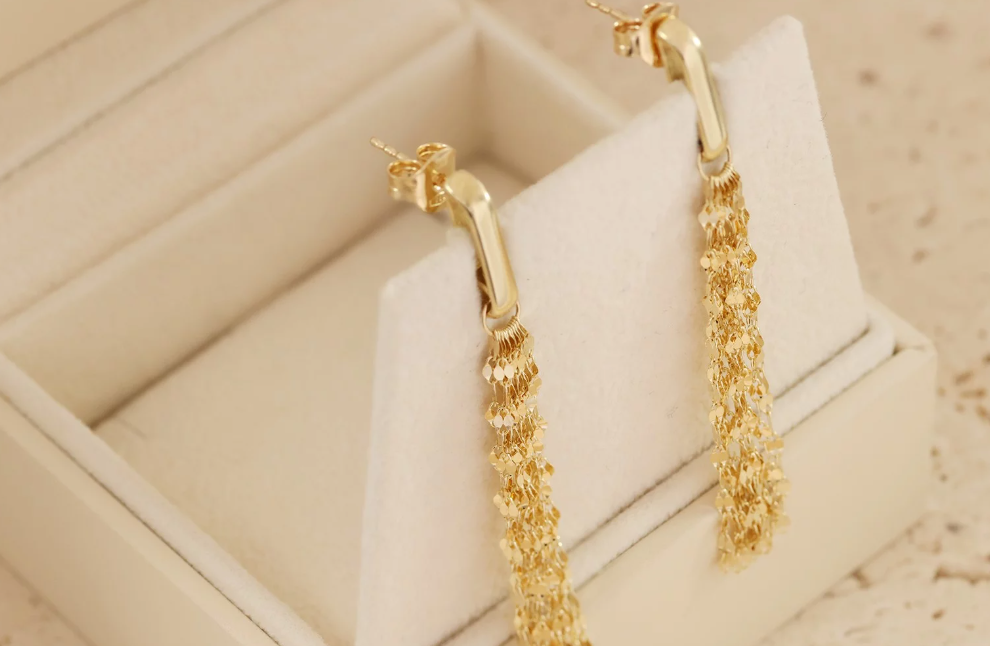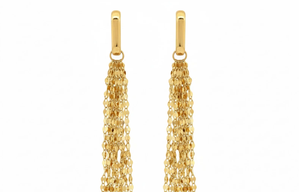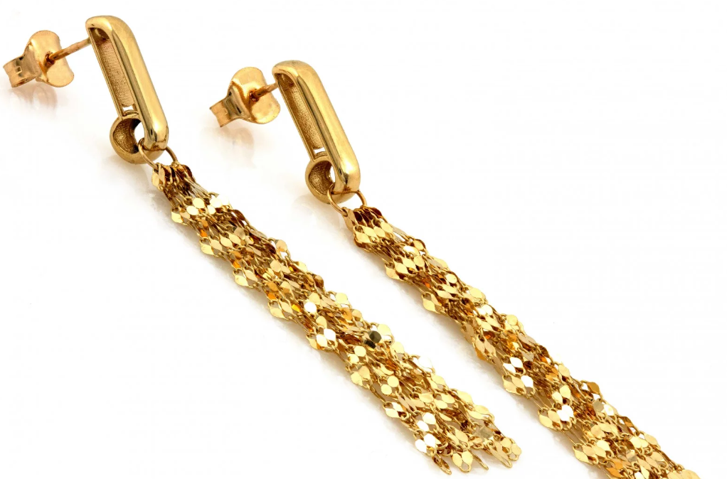 Elegantné visiace náušnice z 14-karátového zlata s jemnými pohyblivými retiazkami, ktoré vytvárajú luxusný lesk pri každom kroku. Nadčasový doplnok pre ženy, ktoré milujú ženskosť a iskru.