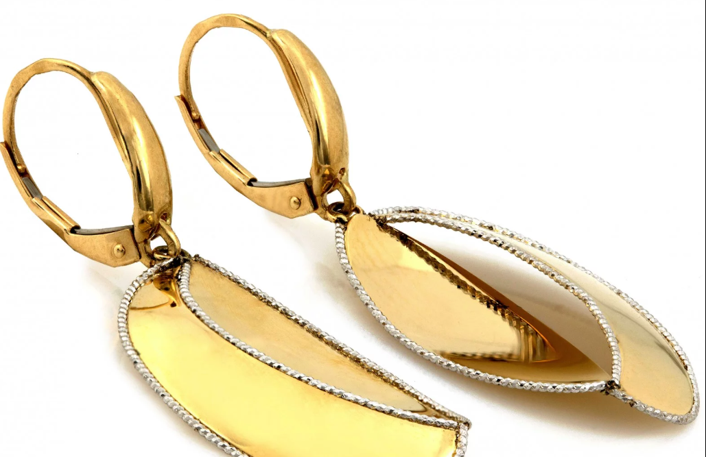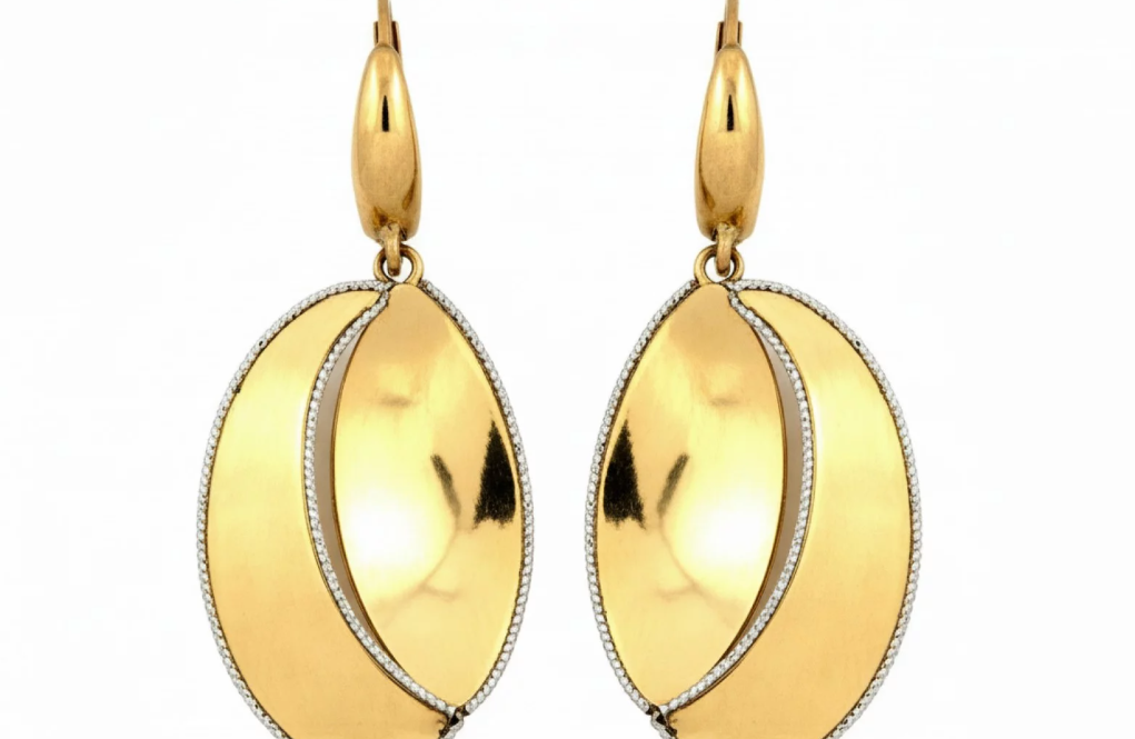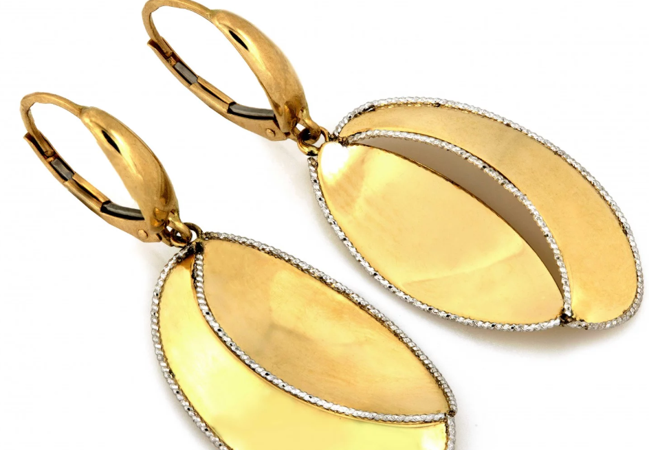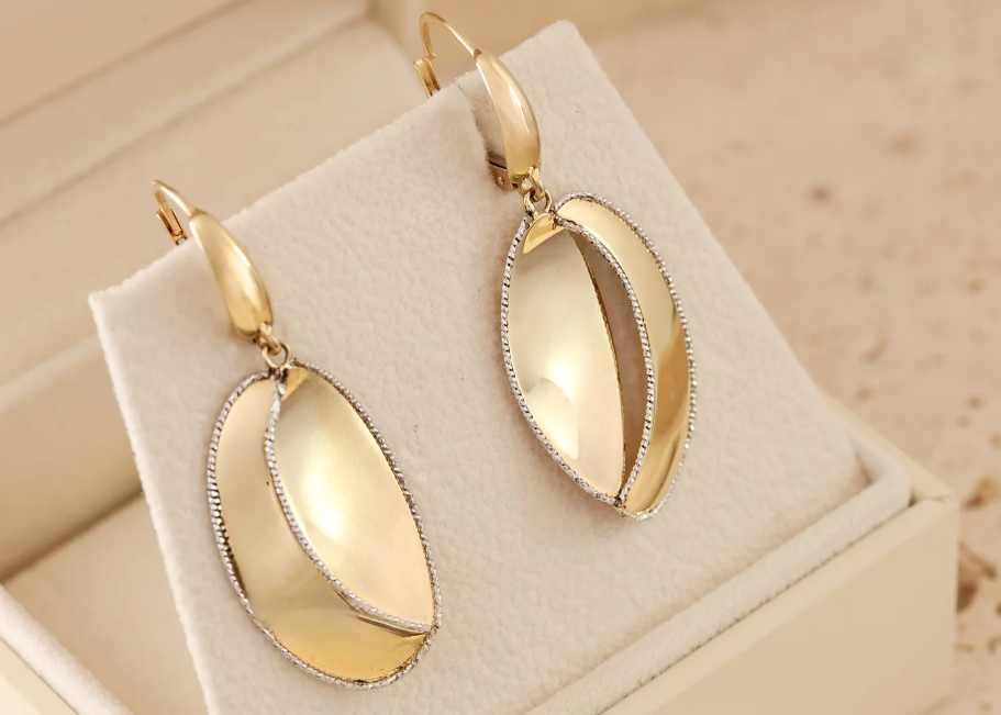 Elegantné oválne visiace náušnice v kombinácii žltého a bieleho zlata. Ich jemne prehnutý tvar vytvára luxusný efekt a nadčasový vzhľad – ideálne na špeciálne príležitosti aj k elegantným outfitom.
