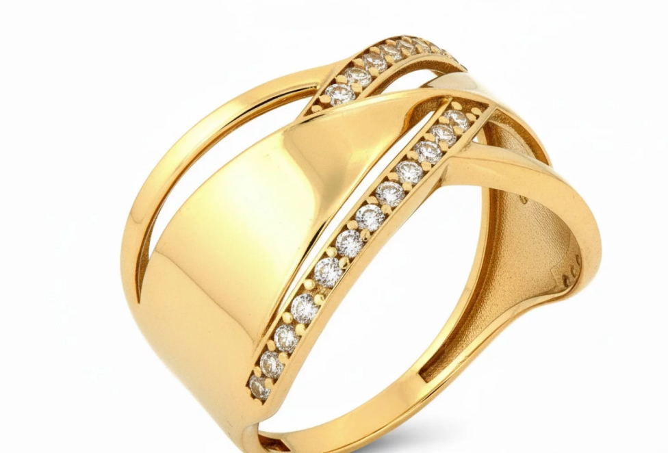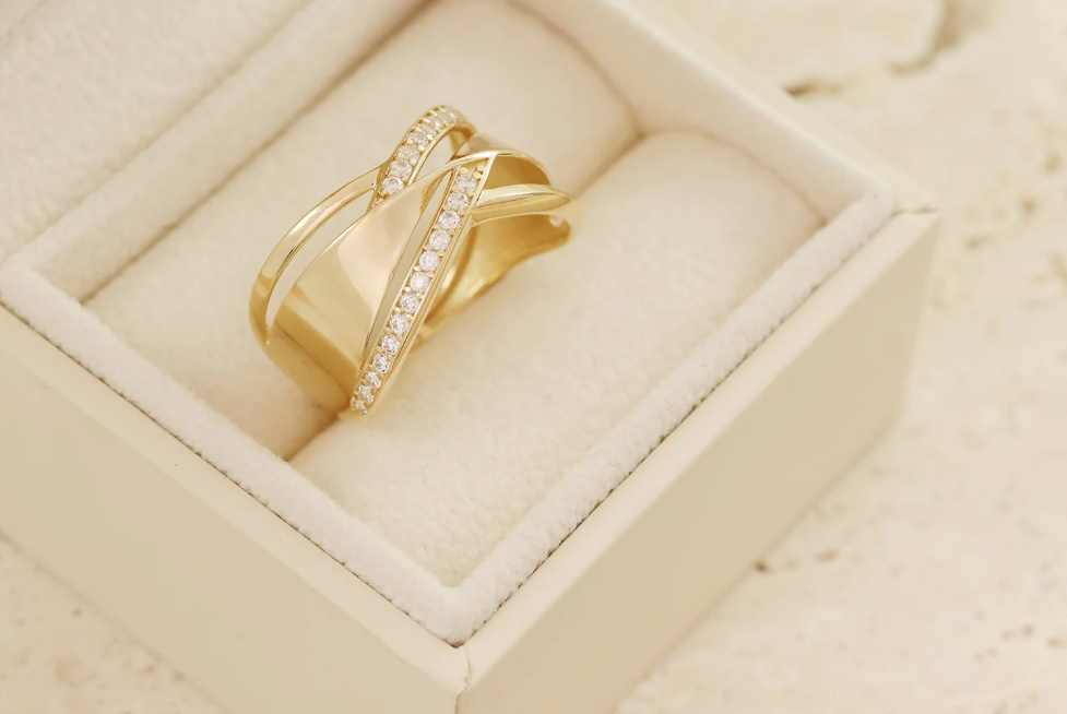 Elegantný dizajnový prsteň zo 14-karátového zlata so zirkónmi, ktorý spája moderné línie s nadčasovou ženskosťou. Výrazný, no stále jemný doplnok pre každodenný aj slávnostný styling.