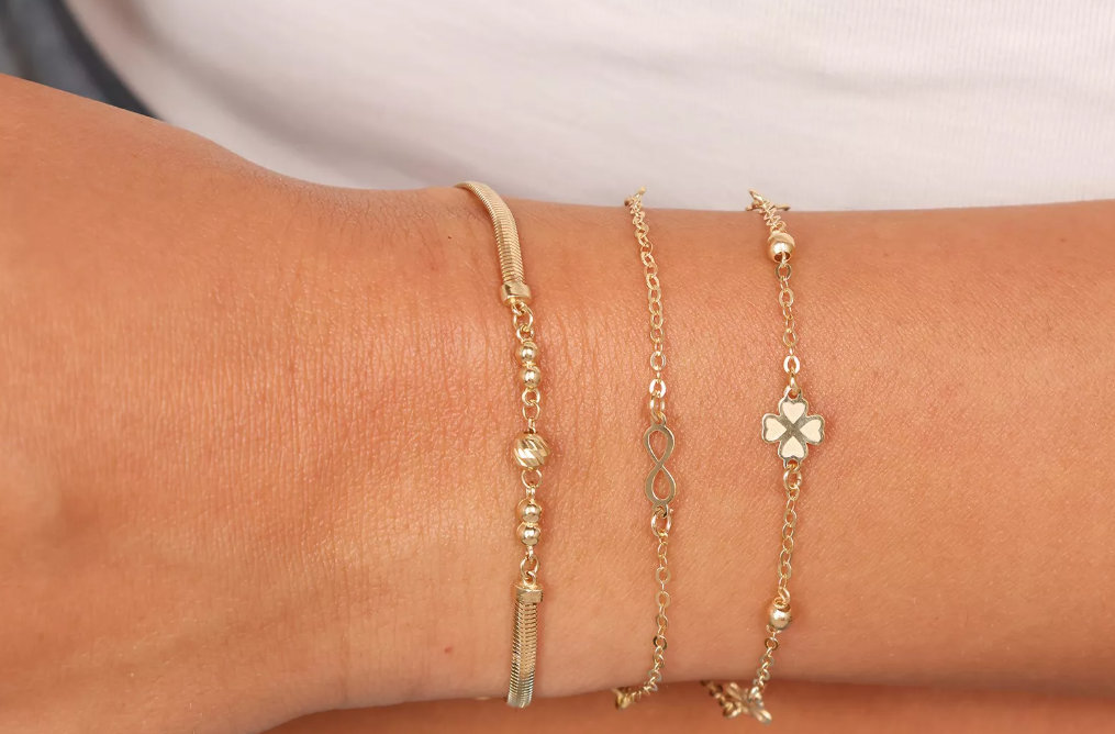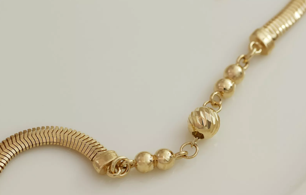 Jemný a zároveň výrazný zlatý náramok s lesklými guľôčkami, ktoré dodávajú šperku pohyb a elegantný detail.