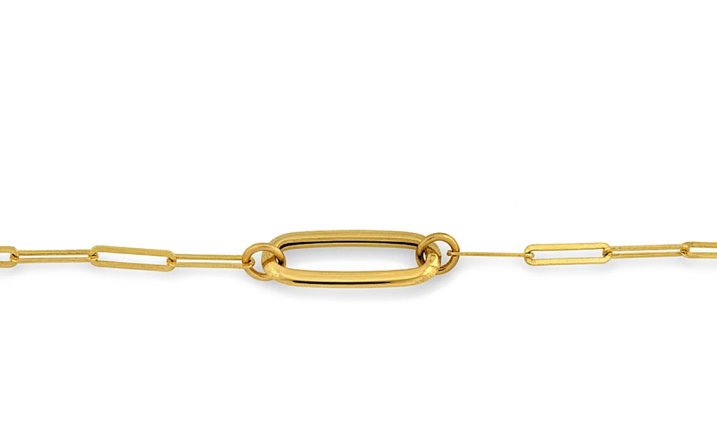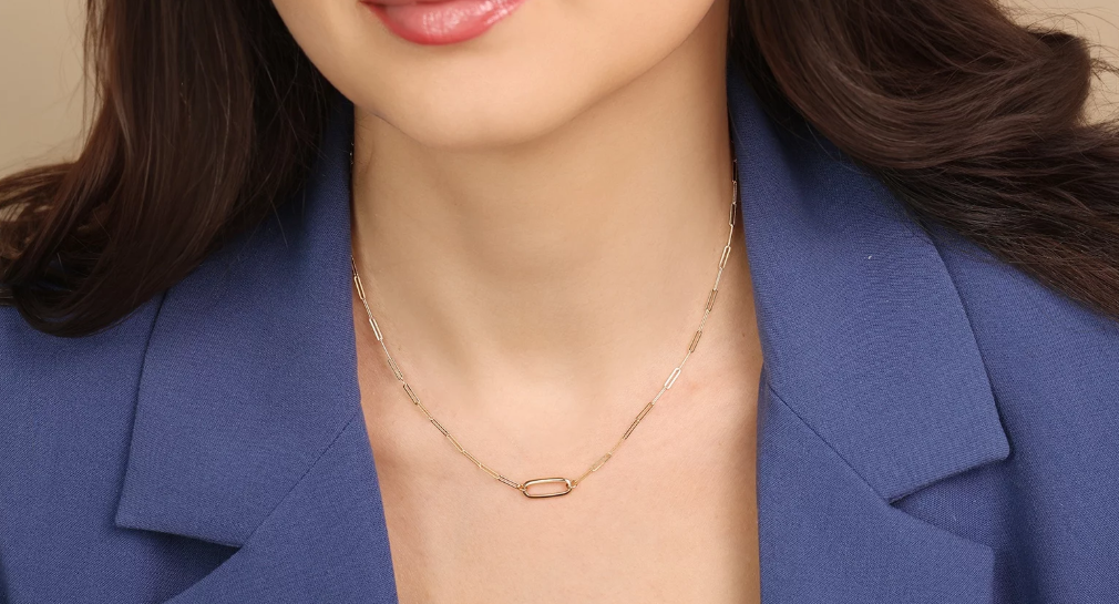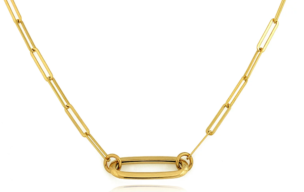 Zlatý náhrdelník Golden Link Élégance predstavuje dokonalé spojenie moderného dizajnu a nadčasovej elegancie. Dominantou šperku je jemne zaoblený oválny prvok, ktorý je harmonicky prepojený s predĺženými článkami retiazky.