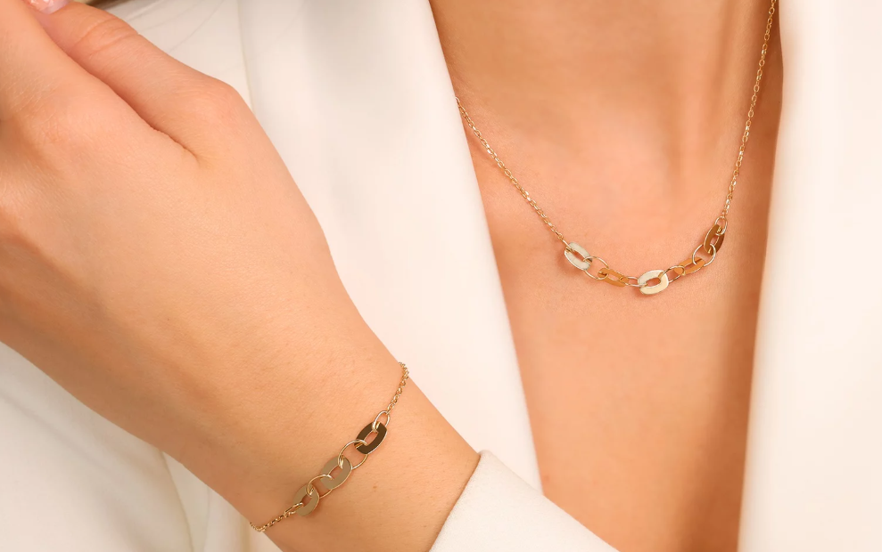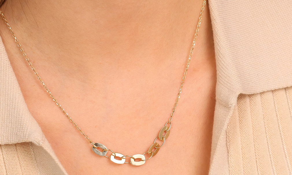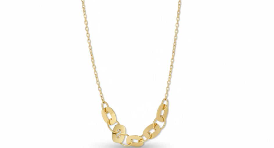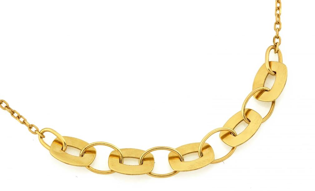 Zlatý náhrdelník Rovelle je dokonalým spojením moderného dizajnu a nadčasovej elegancie. Jemná retiazka je doplnená o výraznejšie zlaté články, ktoré vytvárajú štýlový kontrast a dodávajú šperku jedinečný charakter.