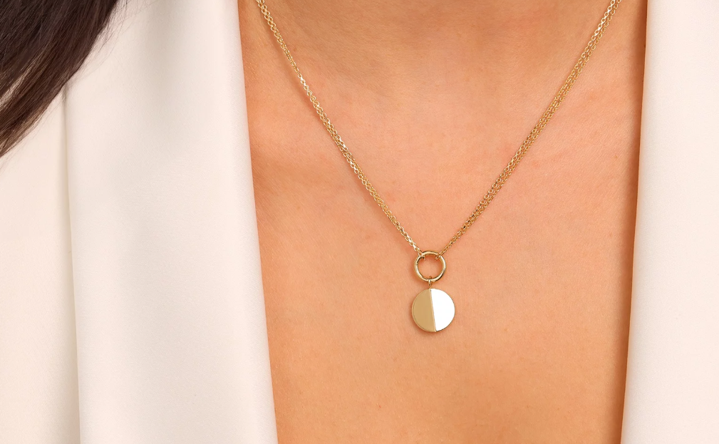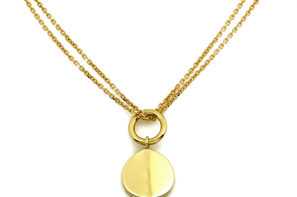 Zlatý náhrdelník Solenne Élégance je dokonalým spojením minimalizmu a sofistikovaného štýlu. Jemná dvojitá retiazka je doplnená o elegantný kruhový detail s hladkým príveskom, ktorý pôsobí čisto, moderne a nadčasovo.