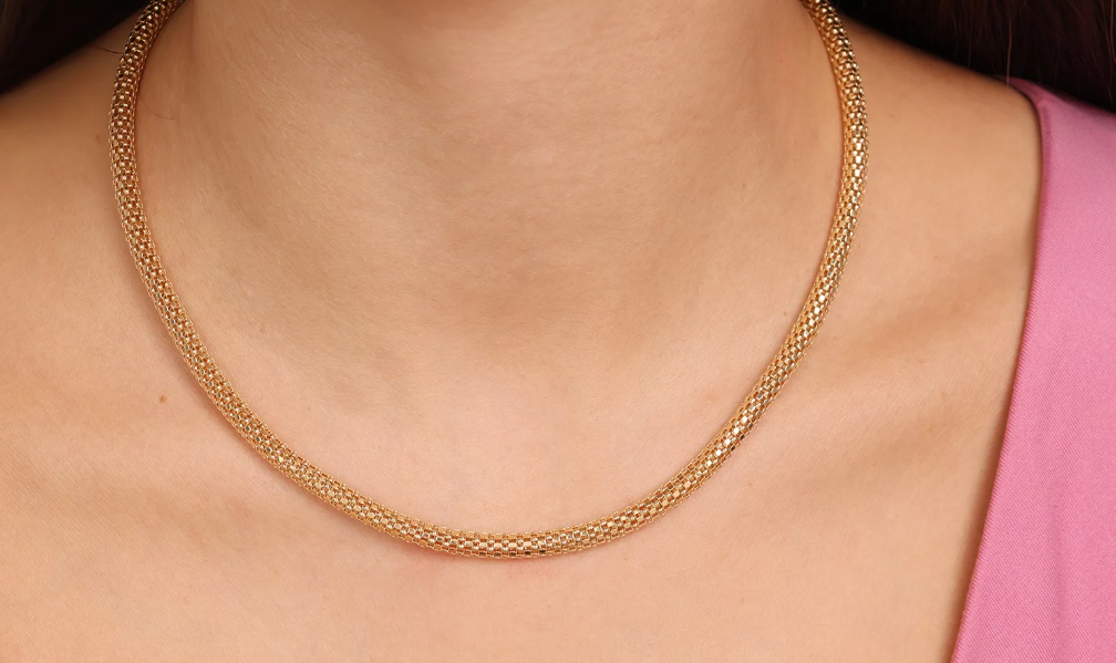 Zlatý náhrdelník Velisse Élégance je stelesnením čistého luxusu a nadčasového štýlu. Precízne prepracovaný prepletaný vzor vytvára jemnú textúru, ktorá nádherne odráža svetlo a dodáva šperku sofistikovaný vzhľad.