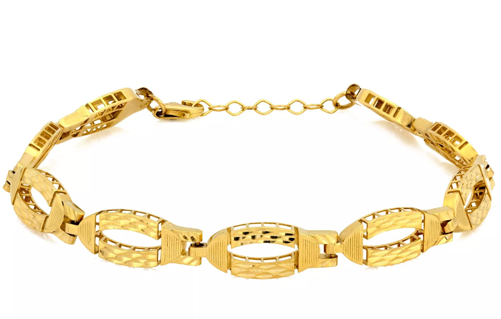 Elegantný zlatý náramok tvoria prepracované oválne články s luxusným gravírovaním, ktoré zachytáva svetlo pri každom pohybe. Jemný, ženský a nadčasový.