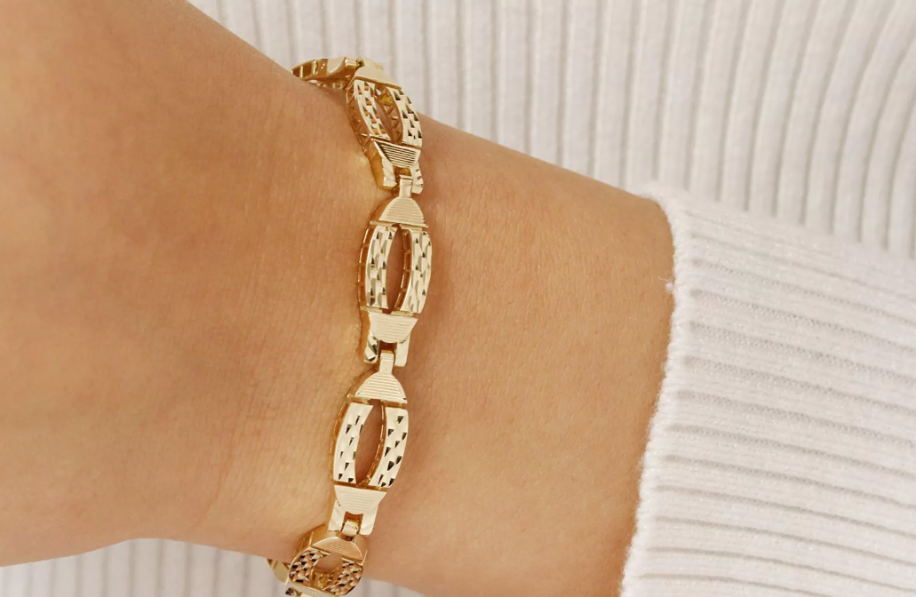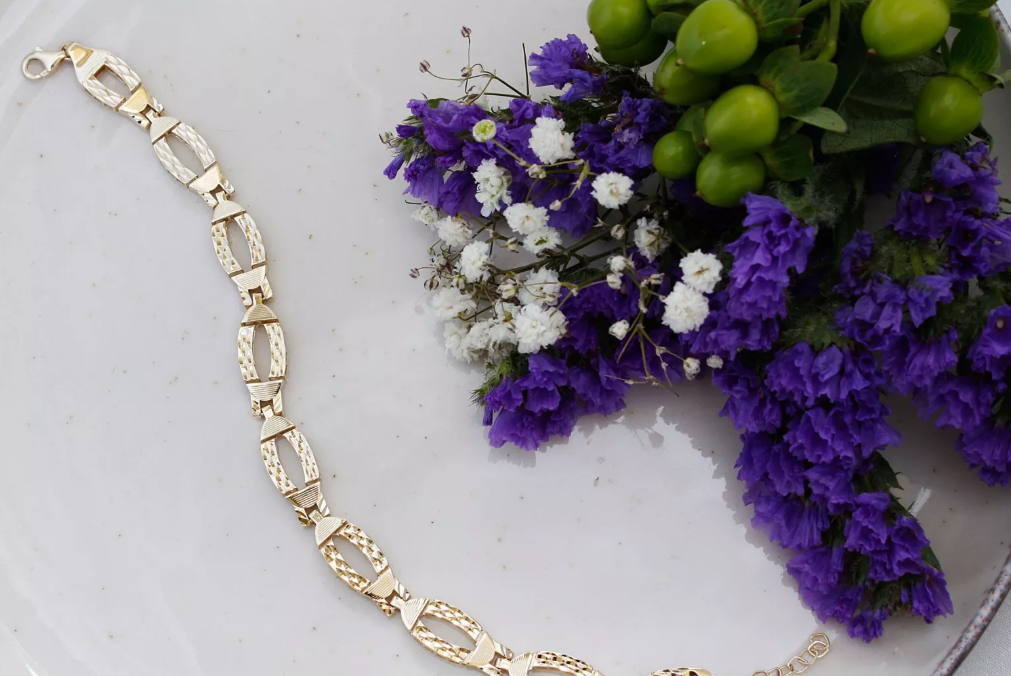 Náramok Elegant Brilliance v sebe spája jemnú geometriu, detailné gravírovanie a žiarivý odlesk 14-karátového zlata. Oválne články sú ľahké, príjemné na nosenie a svojou drobnou textúrou vytvárajú jedinečný efekt, ktorý pôsobí luxusne a elegantne.
