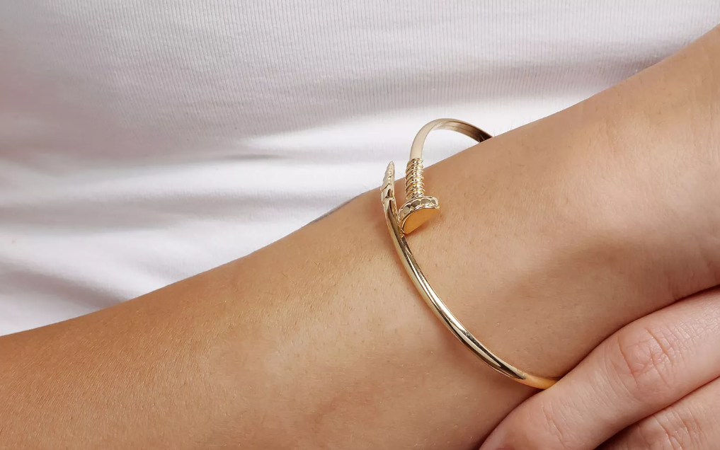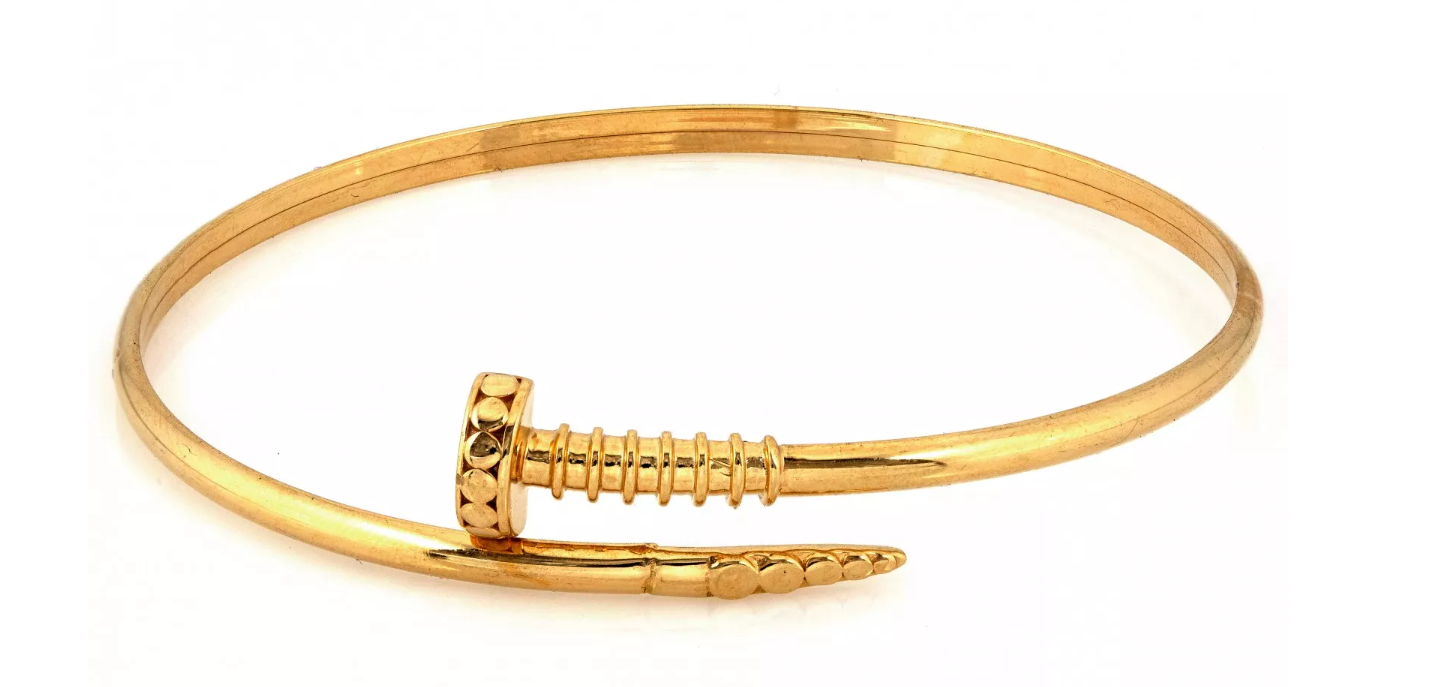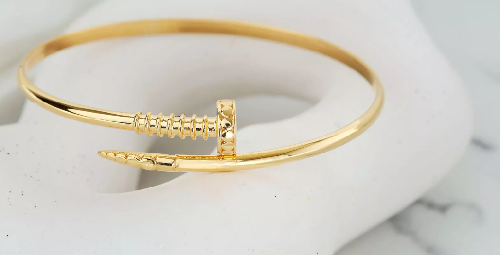Moderný zlatý náramok v ikonickom "nail" dizajne, ktorý spája eleganciu, minimalizmus a jemnú extravaganciu. Dokonalý doplnok pre ženu, ktorá miluje štýlové šperky.