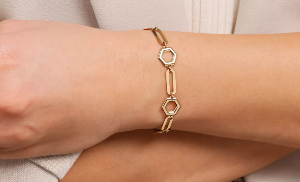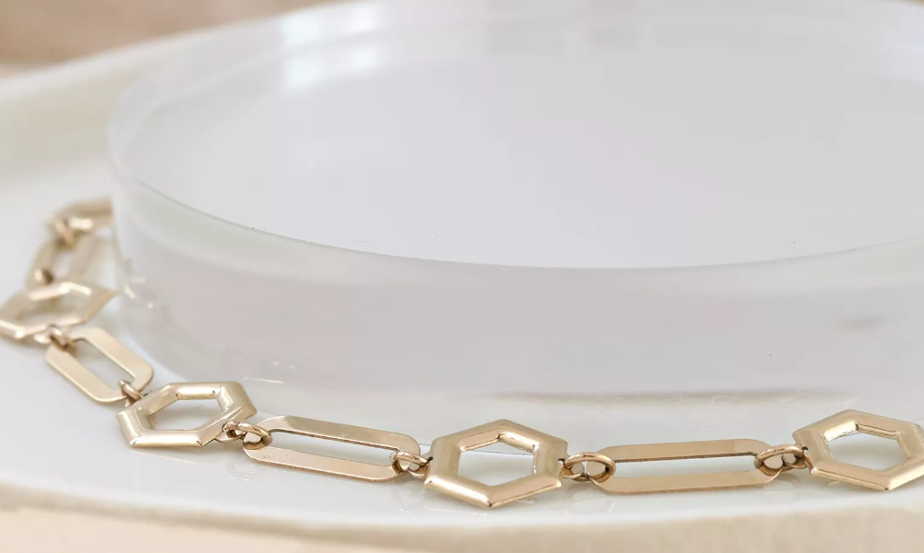 Zlatý náramok Modern Geometry je výnimočný svojím originálnym geometrickým dizajnom. Kombinácia šesťuholníkových článkov a minimalistických obdĺžnikových spojov vytvára luxusný, unikátny a veľmi moderný vzhľad.