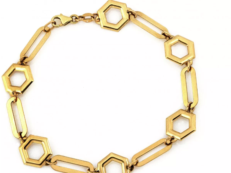 Moderný zlatý náramok s geometrickými šesťuholníkovými článkami. Elegantný, nadčasový a jedinečný doplnok pre ženu, ktorá miluje dizajn a minimalizmus.