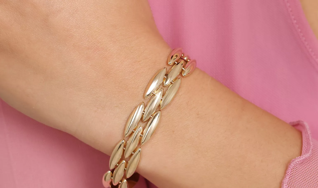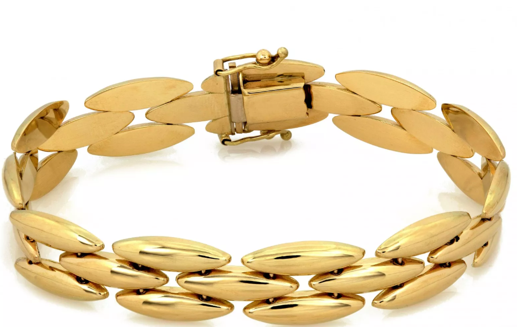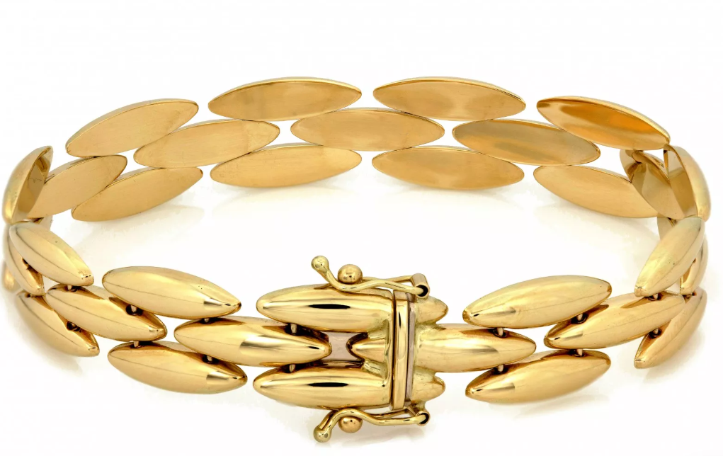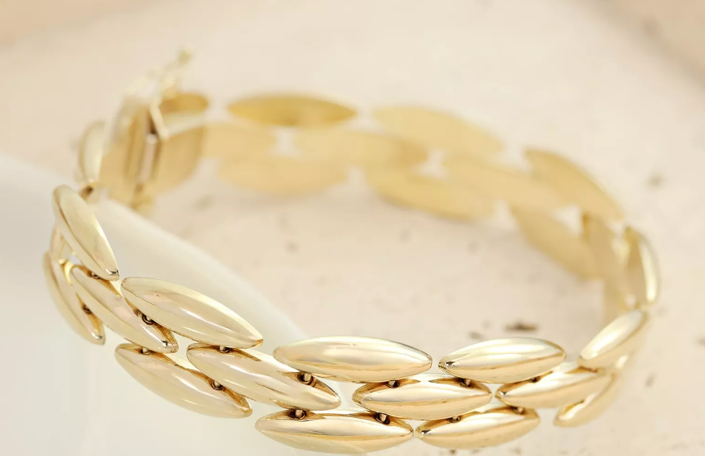 Tento elegantný náramok je vyrobený z 14-karátového zlata a tvorí ho sústava predĺžených mandľových článkov s konvexným tvarom, ktoré zaujmú svojím aerodynamickým vzhľadom. Každý článok je precízne vyleštený do vysokého lesku, čím náramok pôsobí luxusne a exkluzívne.