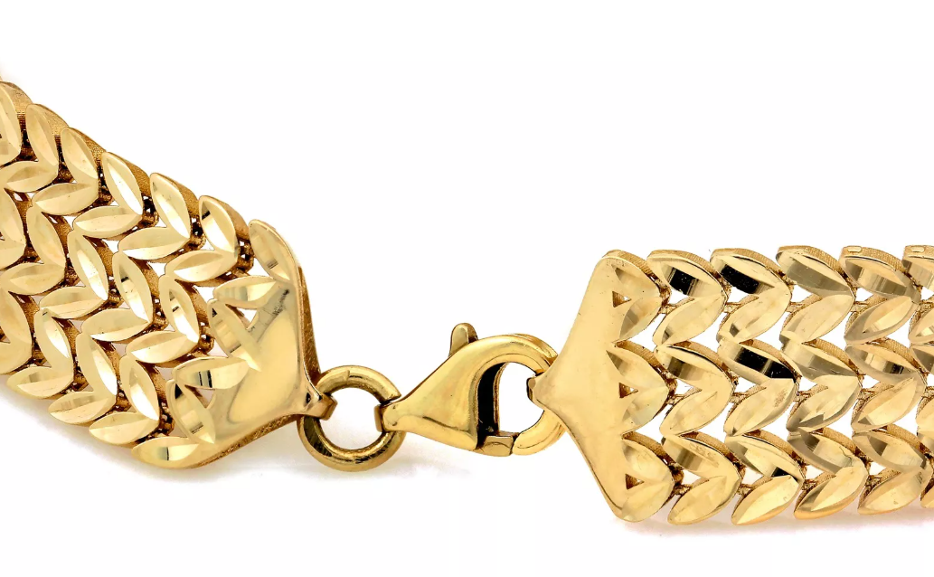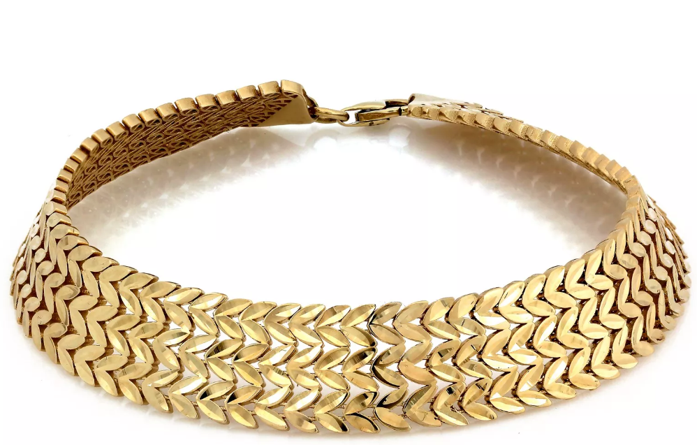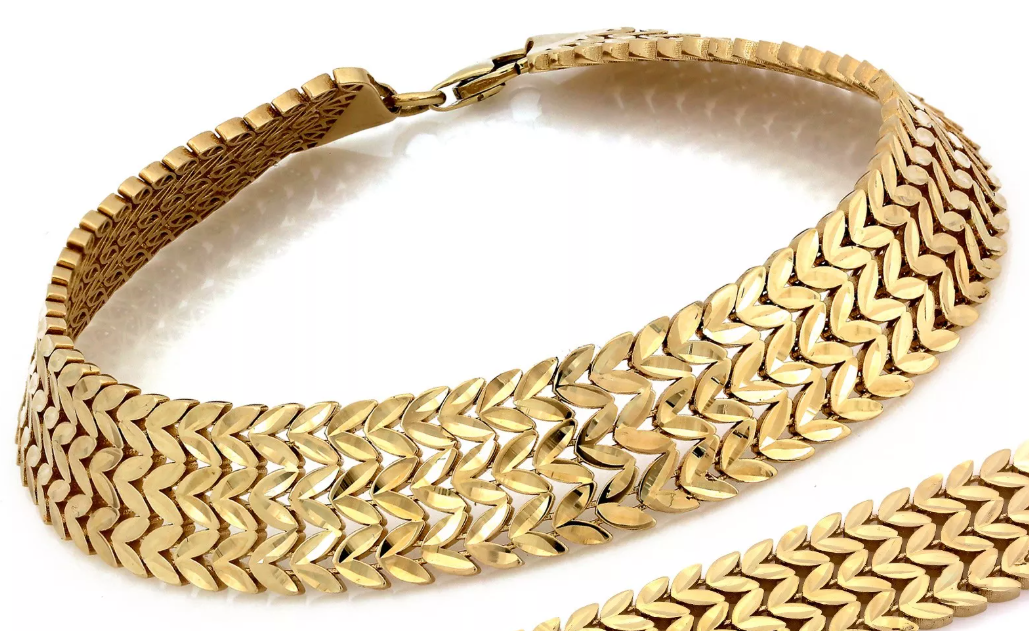 Luxusný dámsky náramok zo žltého 14-karátového zlata s výrazným vzorom rybej kosti. Elegantný šperk, ktorý dodá každej ruke jedinečný pôvab a štýl.