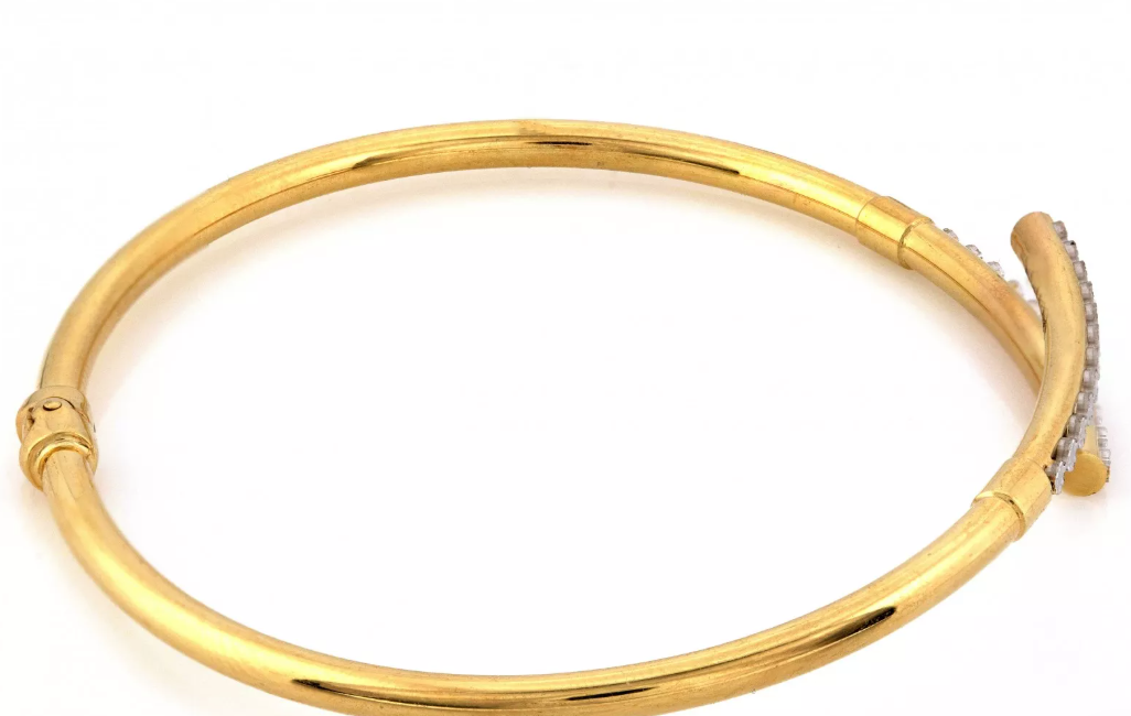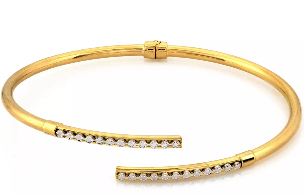 Luxusný pevný náramok zo 14-karátového žltého zlata doplnený o elegantné prvky z bieleho zlata, v ktorých sú precízne osadené trblietavé zirkóny. Dokonalý šperk pre výnimočné chvíle.