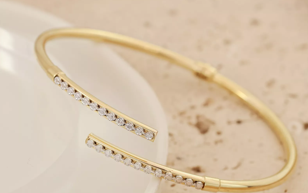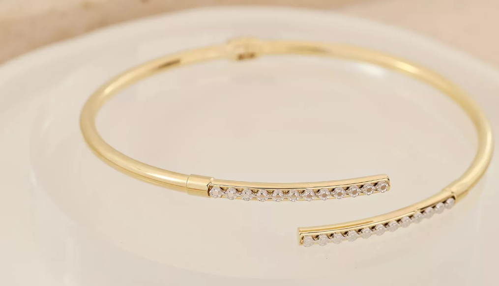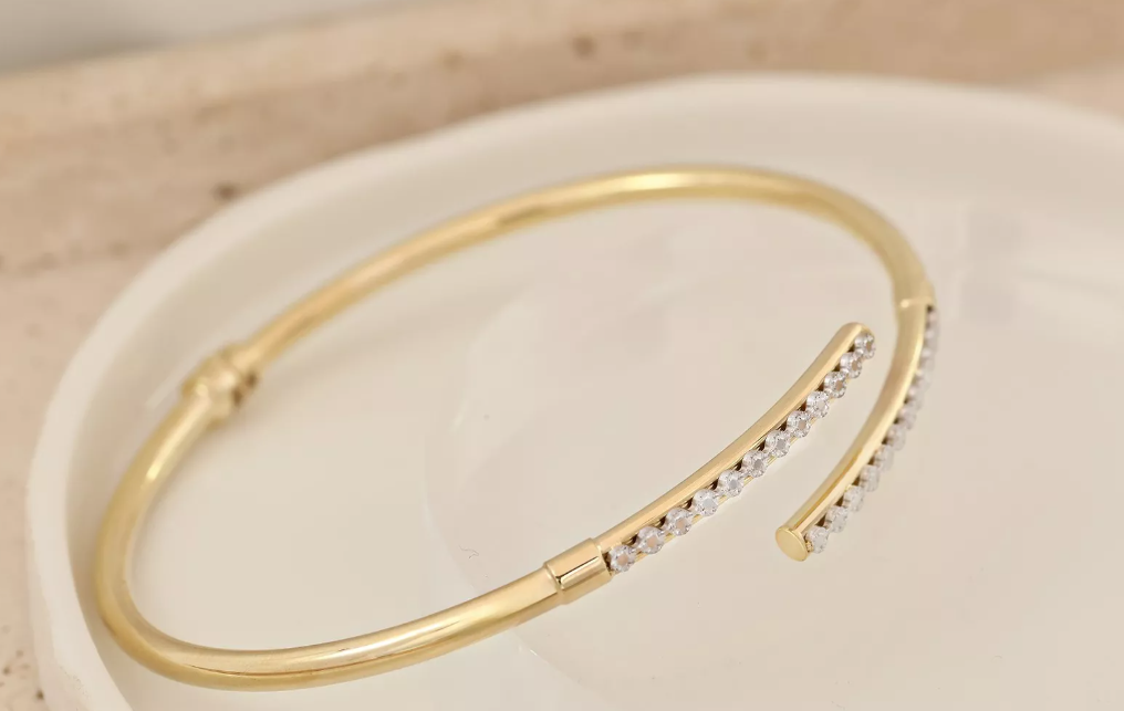 Tento výnimočný zlatý náramok je majstrovským spojením žltého a bieleho 14-karátového zlata. Minimalistická otvorená štruktúra náramku zaručuje pohodlie pri nosení a zároveň pôsobí mimoriadne elegantne. Na oboch koncoch náramku sa nachádzajú lesklé pásy z bieleho zlata, do ktorých sú precízne vsadené zirkóny s dokonalým brúsením. Ich žiarivý lesk vytvára krásny kontrast so zlatým telom náramku a dodáva šperku jemný, no luxusný charakter. Vďaka svojmu nadčasovému dizajnu je tento náramok ideálny doplnok na slávnostné príležitosti aj bežné nosenie. Symbolizuje rovnováhu medzi eleganciou a jednoduchosťou, čím sa stáva neoddeliteľnou súčasťou každej šperkovej kolekcie.