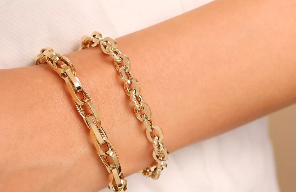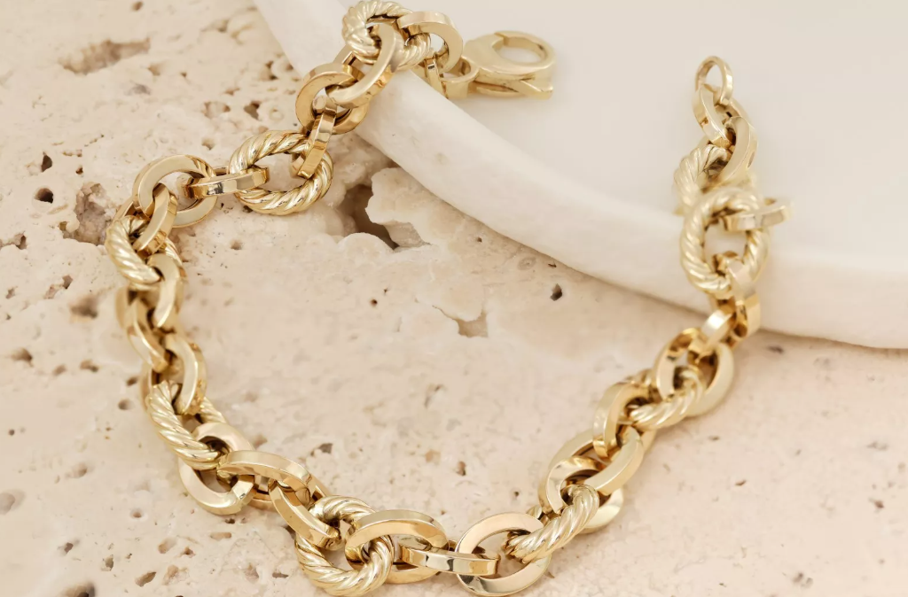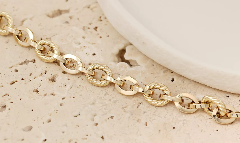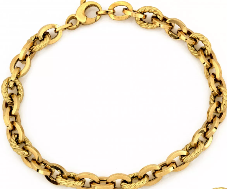 Elegantný náramok vyrobený zo 14-karátového zlata zaujme originálnym dizajnom prepojených hladkých a skrútených kruhových článkov. Dokonalá rovnováha medzi klasickým štýlom a moderným spracovaním robí z tohto šperku ideálny doplnok na každú príležitosť. Tento precízne spracovaný zlatý náramok je vyrobený zo 14-karátového zlata a tvorí ho súhra masívnych hladkých a jemne skrútených článkov, ktoré spolu vytvárajú harmonický a luxusný vzhľad. Vďaka svojmu originálnemu dizajnu pôsobí robustne, no zároveň elegantne. Náramok je vhodný pre ženy aj mužov, ktorí majú radi výrazné, ale zároveň vkusné šperky. Skvelo sa kombinuje s hodinkami alebo inými zlatými doplnkami.