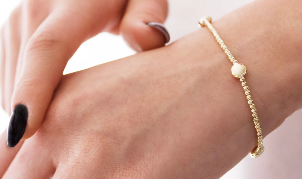 Jemný náramok zo 14-karátového zlata zdobený hladkými guľôčkami. Elegantný a ženský doplnok, ktorý pôsobí moderne a zároveň nadčasovo. Ideálny na bežné nosenie aj ako darček pre milovanú osobu.