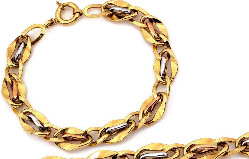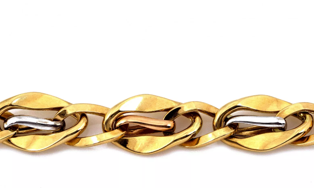 Tento výnimočný náramok spája tri odtiene 14-karátového zlata do jedného harmonického celku. Jemne prepletené články vytvárajú originálny dizajn, ktorý upúta pozornosť svojou hĺbkou a žiarou.
