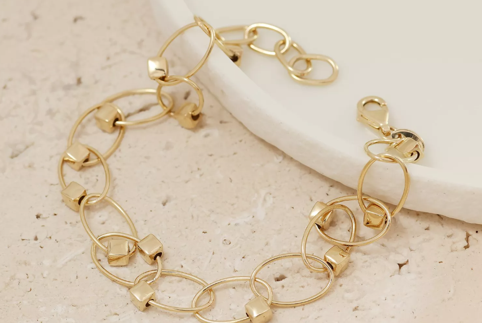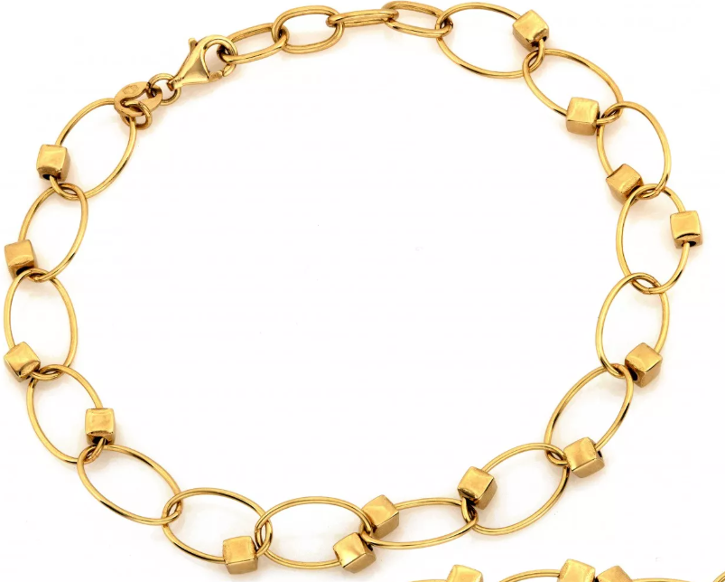 Štýlový zlatý náramok zo 14-karátového zlata zdobený hranatými detailmi a oválnymi očkami. Jemný, no výrazný dizajn pôsobí moderne a sofistikovane, vďaka čomu sa hodí na každodenné nosenie aj špeciálne príležitosti.
