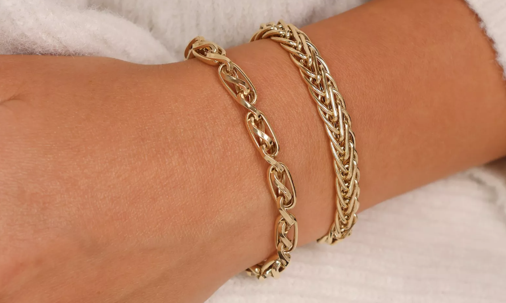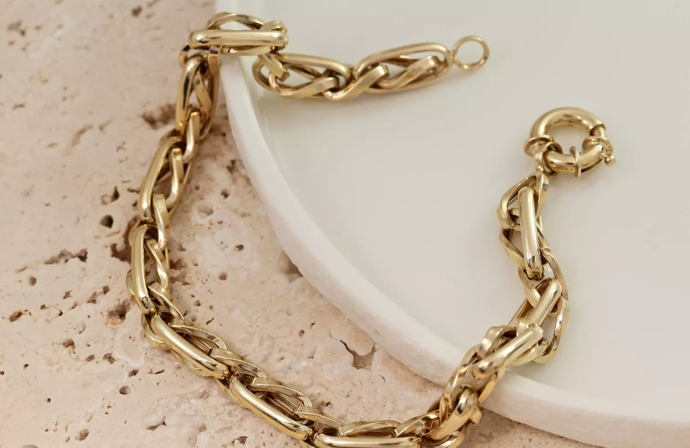 Tento elegantný náramok z 14-karátového zlata zaujme prepleteným dizajnom článkov, ktorý symbolizuje pevnosť a harmóniu. Každý článok je starostlivo vyleštený, aby zachytil svetlo z každého uhla. Spoľahlivé kruhové zapínanie zabezpečuje pohodlné a bezpečné nosenie. Náramok je ideálnym darčekom pre ženy, ktoré oceňujú klasickú eleganciu a trvácny štýl.
