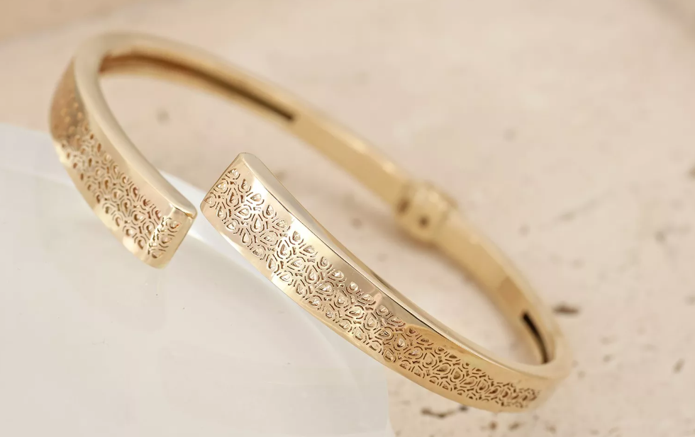 Elegantný náramok zo 14-karátového zlata s precíznym kvetinovým gravírom. Nadčasový kúsok, ktorý vyniká svojou jemnosťou a ženskosťou. Ideálny doplnok na každodenné nosenie aj výnimočné príležitosti.