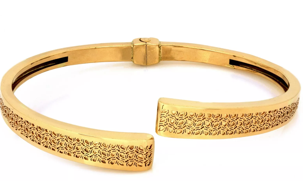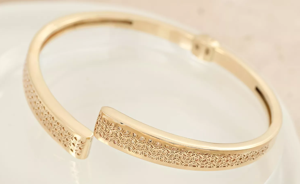 Tento zlatý náramok je stelesnením elegancie a remeselnej precíznosti, ktorému dominuje jemný rytý kvetinový vzor vytvárajúci hru svetla a tieňa. Vďaka svojmu polootvorenému dizajnu sa pohodlne prispôsobí zápästiu a pôsobí sofistikovane bez ohľadu na štýl outfitu. Je vhodný pre ženy, ktoré si potrpia na detaily a dávajú prednosť šperkom s osobitým charakterom. Skvele sa kombinuje s jemnými prsteňmi alebo minimalistickými náušnicami.