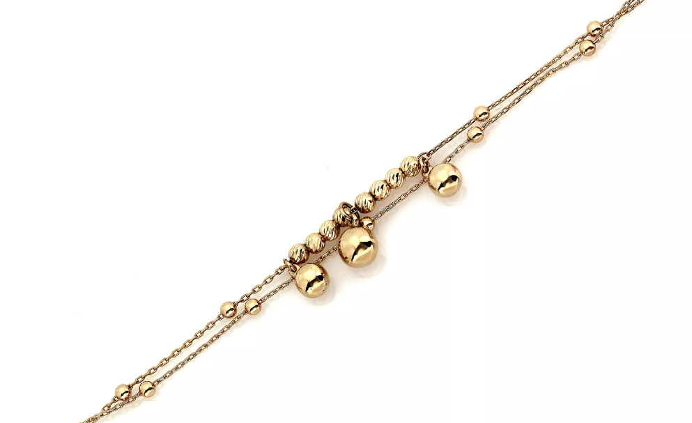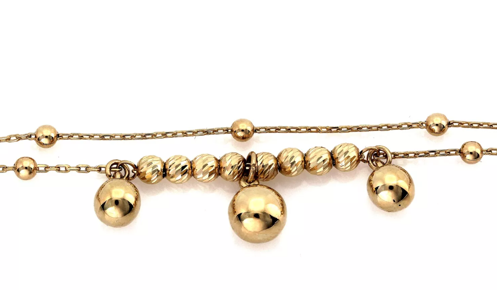 Jemný zlatý náramok vyrobený zo 14-karátového zlata, ozdobený lesklými guľôčkami na dvojitej retiazke. Elegantný šperk, ktorý dokonale zvýrazní ženskosť a zmysel pre detail.