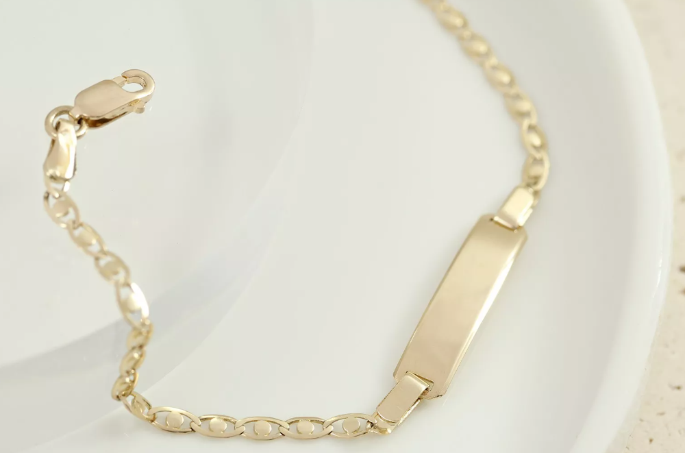 Elegantný personalizovaný náramok zo 14-karátového zlata s platničkou, na ktorú je možné vygravírovať meno, dátum alebo iniciály zdarama. Ideálny darček pre ženy, ale aj dievčatá aj chlapcov – k prvému svätému prijímaniu, narodeninám či výročiu.