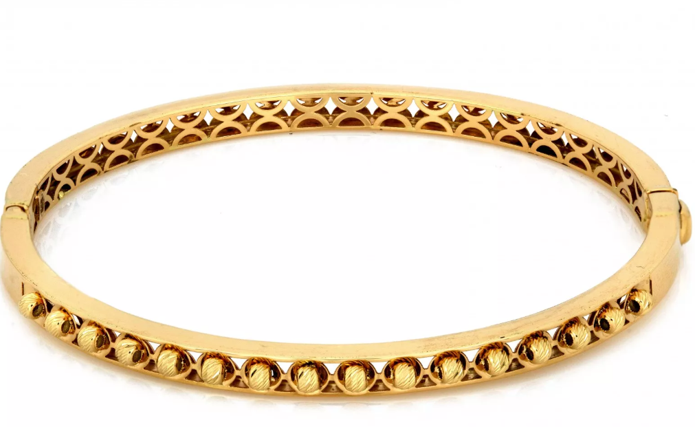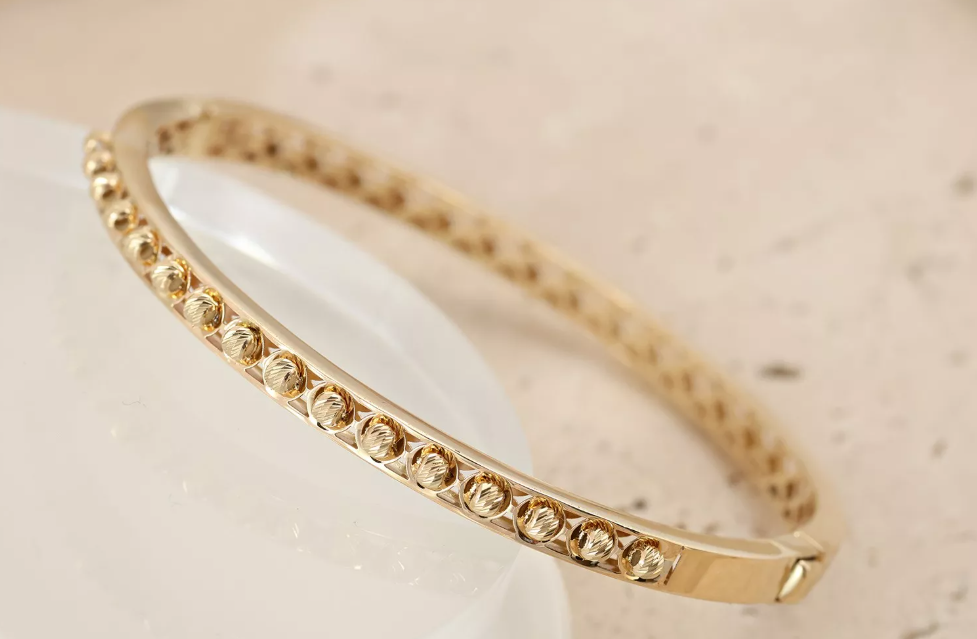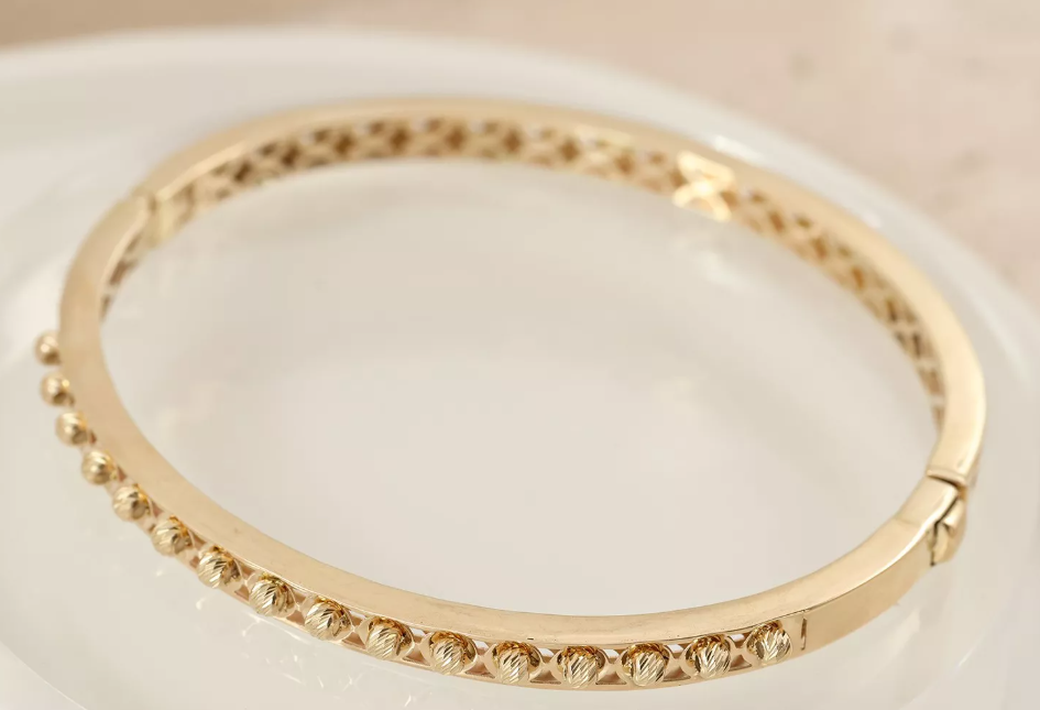 Elegantný pevný náramok zo 14-karátového zlata zdobený jemnými gravírovanými guľôčkami po celom obvode. Nadčasový doplnok, ktorý vynikne svojím leskom a detailným spracovaním.