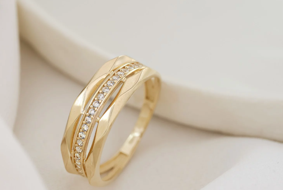 Masívny zlatý prsteň 14k so zirkónmi Golden Élan Ring je výrazný dizajnový šperk, ktorý spája moderné línie, luxus a nadčasovú eleganciu.